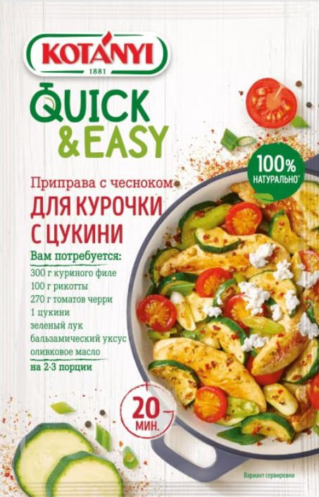 Kotanyi Приправа с чесноком для курочки с цукиниВ данный момент этот товар отсутствует в продаже. Возможно, у нас найдется аналогичный или похожий товар здесь. С приправой Quick & Easy вы сможете приготовить вкусное блюдо с хрустящими овощами, нежной курочкой и сливочной рикоттой. Что вам потребуется? 5 ингредиентов и 20 минут, а мы уже подготовили травы и специи. |