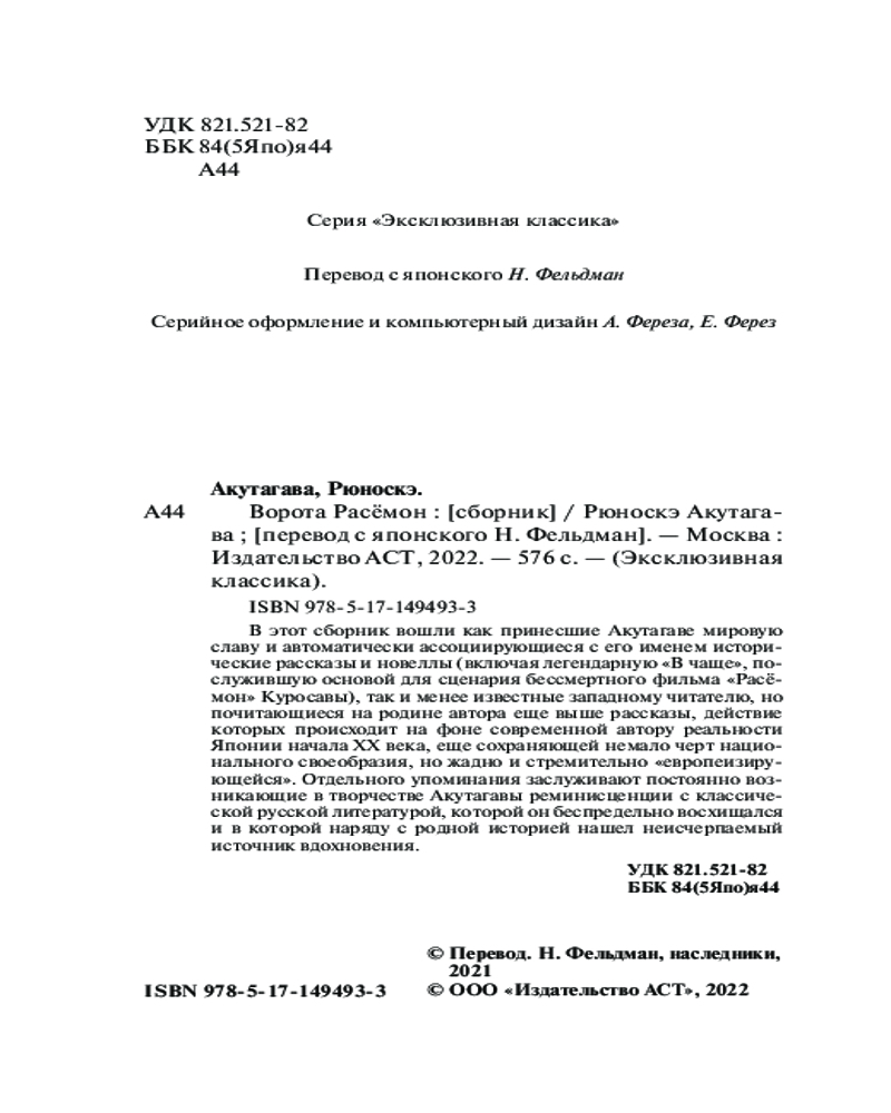 Ворота РасёмонВ данный момент этот товар отсутствует в продаже. Возможно, у нас найдется аналогичный или похожий товар здесь. Серия: Эксклюзивная классика (Лучшее) В этот сборник вошли как принесшие Акутагаве мировую славу и автоматически ассоциирующиеся с его именем исторические рассказы и новеллы (включая легендарную «В чаще», послужившую основой для сценария бессмертного фильма «Расёмон» Куросавы), так и менее известные западному читателю, но почитающиеся на родине автора еще выше рассказы, действие которых происходит на фоне современной автору реальности Японии начала ХХ века, еще сохраняющей немало черт национального своеобразия, но жадно и стремительно «европеизирующейся». Отдельного упоминания заслуживают постоянно возникающие в творчестве Акутагавы реминисценции с классической русской литературой, которой он беспредельно восхищался и в которой наряду с родной историей нашел неисчерпаемый источник вдохновения. |