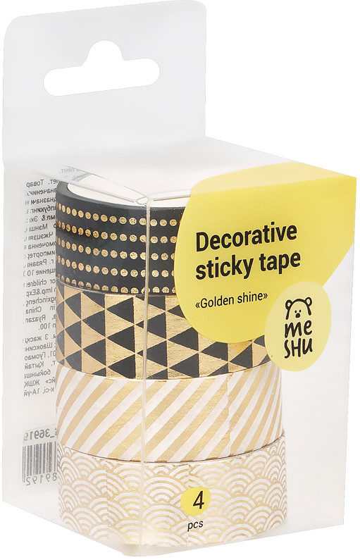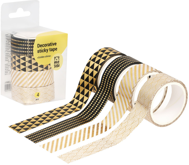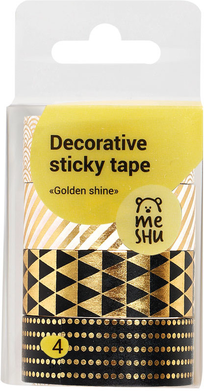 Meshu Набор клейких декоративных лент «Golden shine»В данный момент этот товар отсутствует в продаже. Возможно, у нас найдется аналогичный или похожий товар здесь. Декоративные клейкие ленты предназначены для упаковки подарков, оформления поделок, элементов интерьера и скрапбукинга. Открытки, альбомы, ежедневники, подставки, цветочные горшки, подсвечники, рамки и много другое может преобразиться с декоративными лентами. Яркие и современные дизайны сделают процесс творчества увлекательным, а результат впечатляющим. А качественная клеевая основа позволит надёжно зафиксировать ленту и быть уверенным в долговечности декора. |
