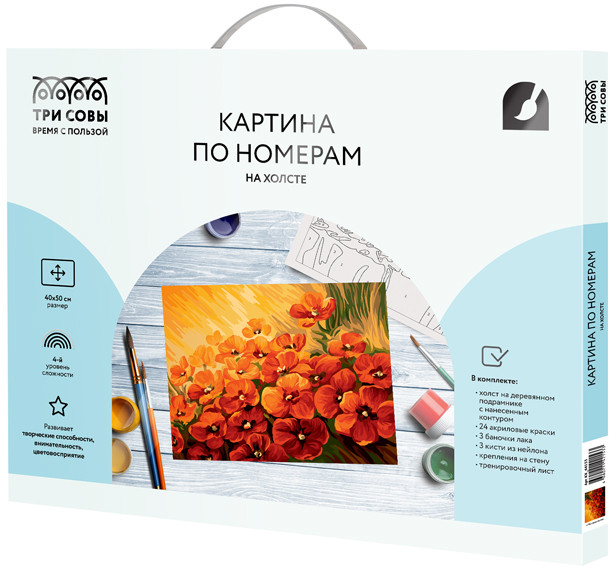• холст на деревянном подрамнике 40×50 с нанесенным контуром, пронумерованный в соответствии с номерами красок. Контур под раскрашивание нанесен в том числе и на торцы подрамника, что позволяет разместить готовую работу на стене не обрамляя в багет или раму. Технология точной разбивки сюжета картины на разные цветовые оттенки гарантируют правильность исполнения полотна;