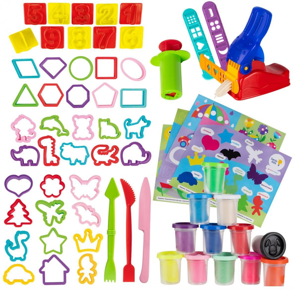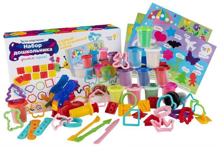 Genio Kids Набор для лепки «Самый огромный»В данный момент этот товар отсутствует в продаже. Возможно, у нас найдется аналогичный или похожий товар здесь. Набор дошкольника — это развивающий творческий набор для деток от белорусского бренда Genio Kids, которые вот-вот пойдут в первый класс! В картонный бокс входят различные вырубные формочки, штампики-цифры, обучающие вкладыши, давилка и шприц, а также целых 12 баночек разноцветного теста-пластилина, общей массой 600 грамм. Каждый брусок пластилина удобно хранится в пластиковой баночке с крышкой, которая предохраняет от высыхания. |