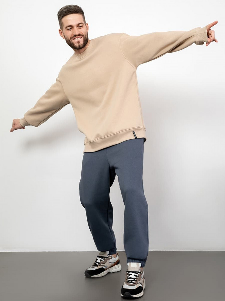 Свитшот свободного силуэта из футера — мягкого, гигроскопичного и неприхотливого трикотажного полотна. Футер теплый, с подчесом. Горловина круглой формы, рукава длинные и широкие. Манжеты и пояс — из рибаны. Спущенная линия плеча и углубленная пройма дарят комфорт и гарантируют полноту движений.