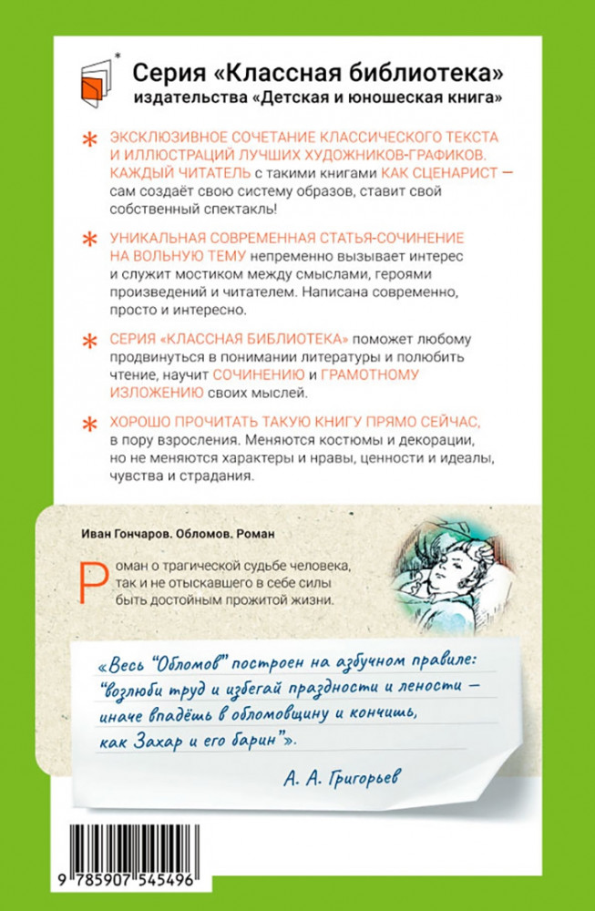 Серия: Классная библиотека Роман «Обломов» — центральное произведение в знаменитой трилогии Ивана Александровича Гончарова (1812–1891). Гончаров создал героя, имя которого стало нарицательным. Его отождествляют с русской ленью и русской хандрой, считают воплощением национального характера. Однако это не мешает критикам и читателям находить в образе Обломова черты Гамлета и Манилова, Дон Кихота и даже Печорина. Автор показывает трагическую судьбу умного человека, так и не отыскавшего в себе силы быть достойным прожитой жизни. |