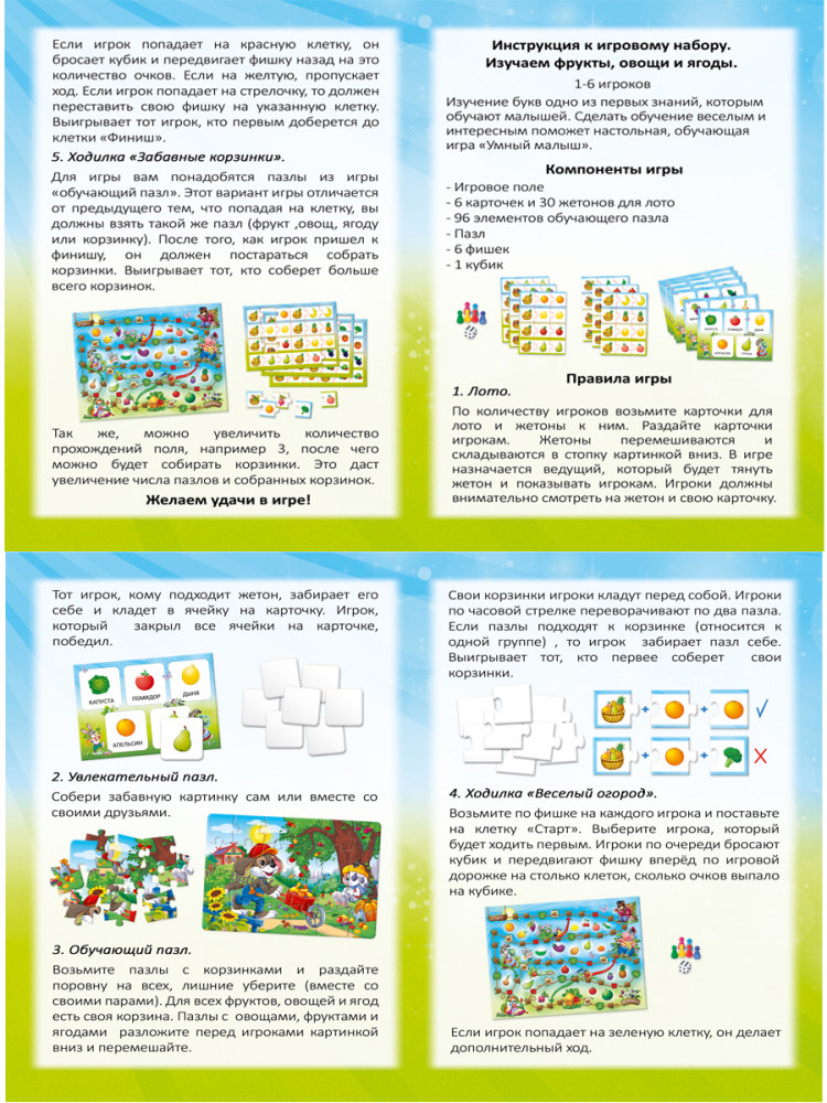 Рыжий кот Игра настольная «Изучаем фрукты, овощи и ягоды»В данный момент этот товар отсутствует в продаже. Возможно, у нас найдется аналогичный или похожий товар здесь. Серия: Умный малыш Обучающая игра «Умный малыш» с особенным комплексом занятий для малышей, которые только начинают учиться. Мы собрали для вас 5 самых интересных и познавательных заданий в наборе «Изучаем фрукты, овощи и ягоды», которые обучат и увлекут даже самых заядлых непосед, а красочные картинки и подача материала в игровой форме дадут хороший результат. Одновременно могут играть от 2 до 6 игроков. |