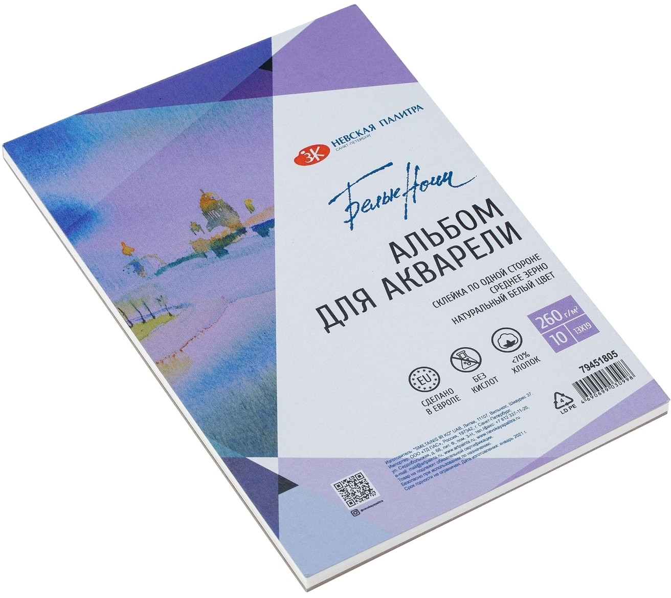 Акварельная бумага альбома-склейки «Белые ночи» от известного бренда «Невская палитра» отличается высочайшим качеством. Идеально подходит для акварели, а также для гуаши и акрила. Бумага изготовлена из целлюлозы с добавлением хлопка не менее 70%. При производстве не используется хлор, кислоты и оптические отбеливатели, что гарантирует длительную сохранность готовых работ. Плотная задняя обложка служит планшетом и обеспечивает комфортную работу с альбомом дома и на пленэре.