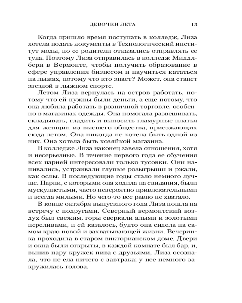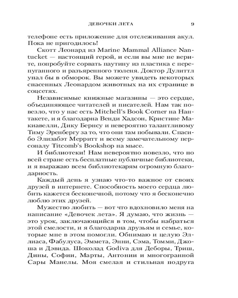 Автор уже более тридцати пяти лет живет на Нантакете. В романе «Девочки лета» ей удалось передать неповторимую атмосферу острова, наполнить историю уникальными персонажами и сделать нас свидетелями удивительных событий в жизни каждого из них.