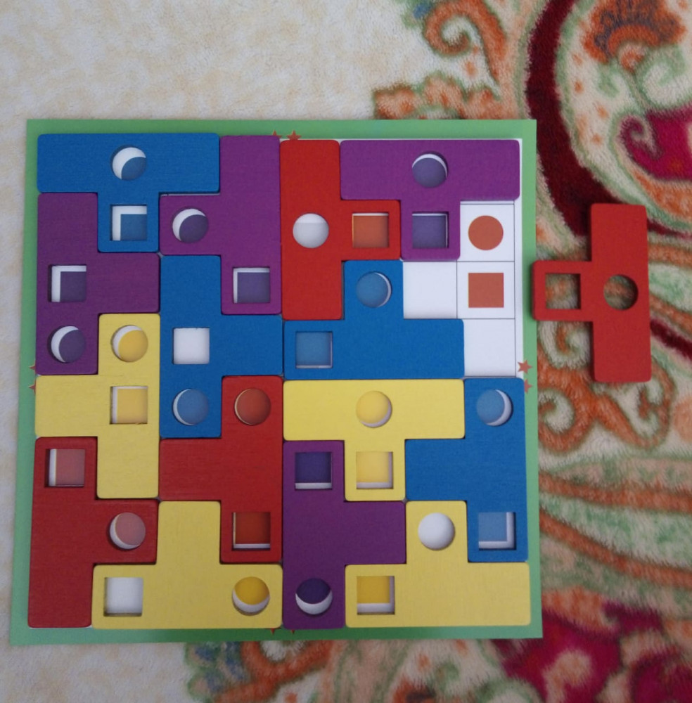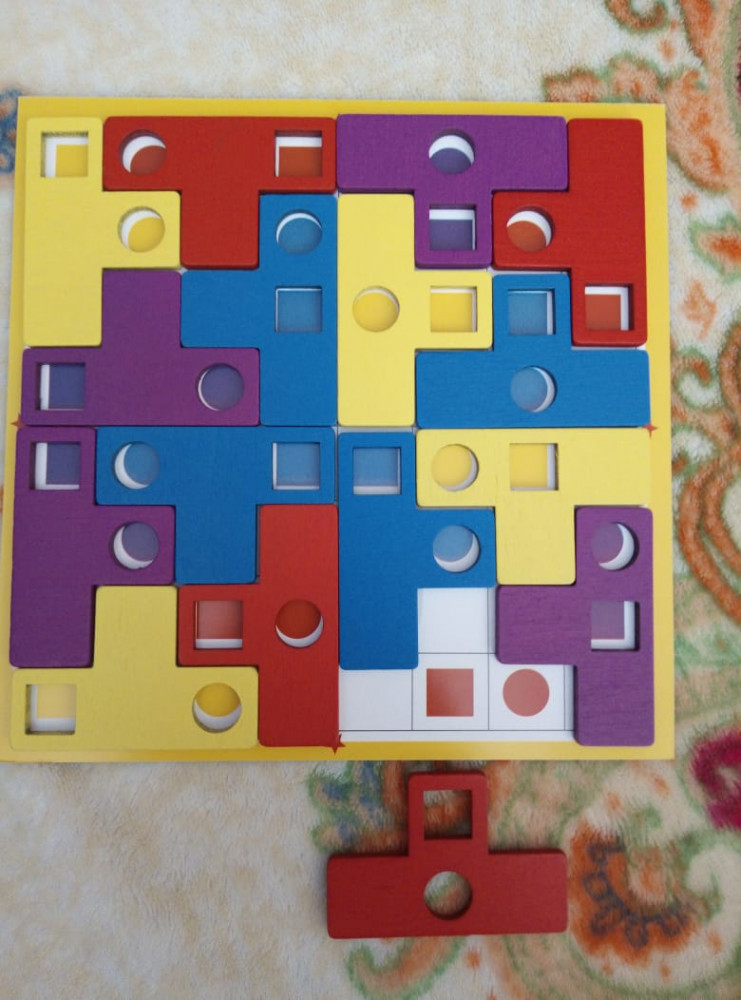 С повышением сложности заданий количество цветных значков на карточках уменьшается, поэтому часть отверстий карточек останутся пустыми.