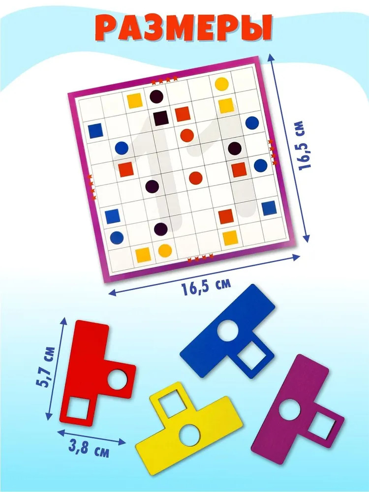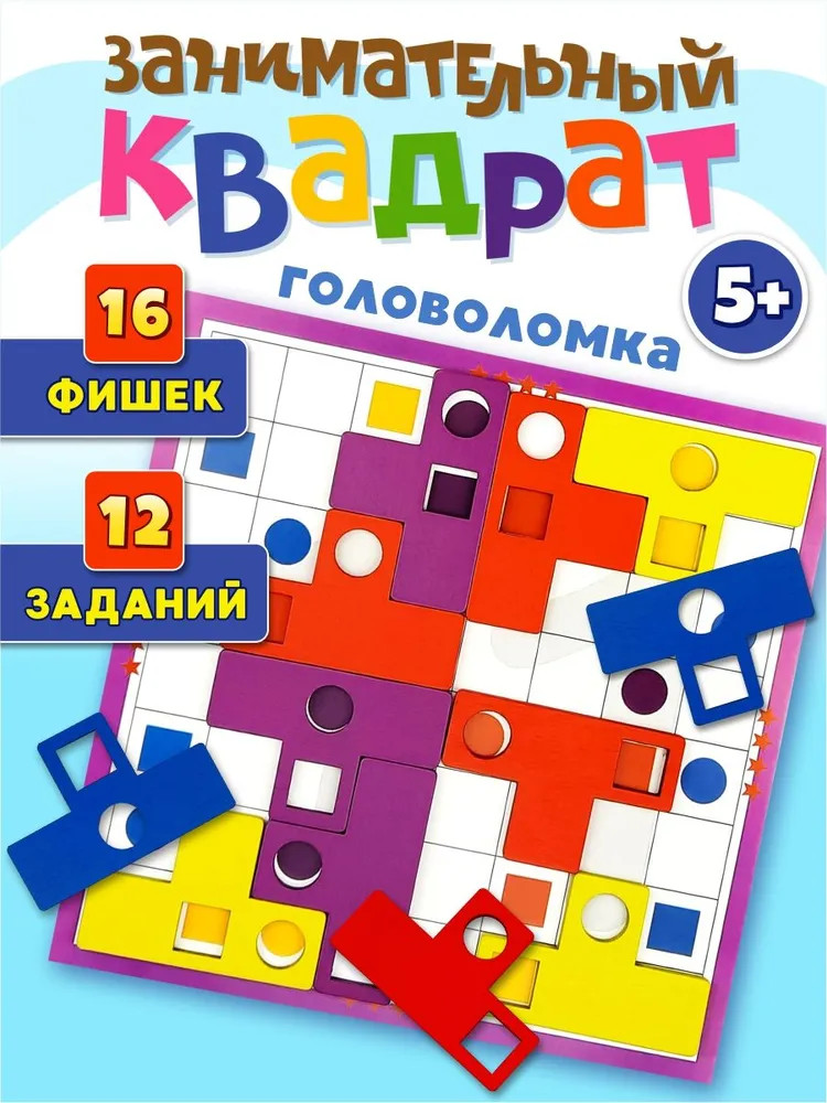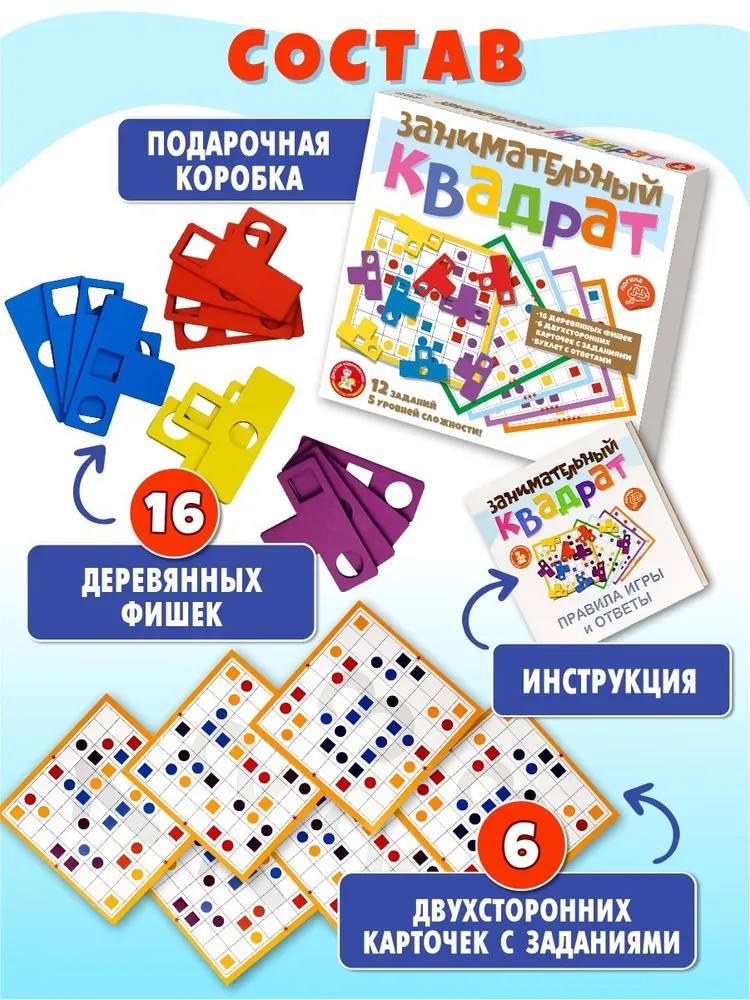 • двухсторонние карточки с заданиями разного уровня сложности — 6 шт (16,5×16,5 см, всего 12 заданий);