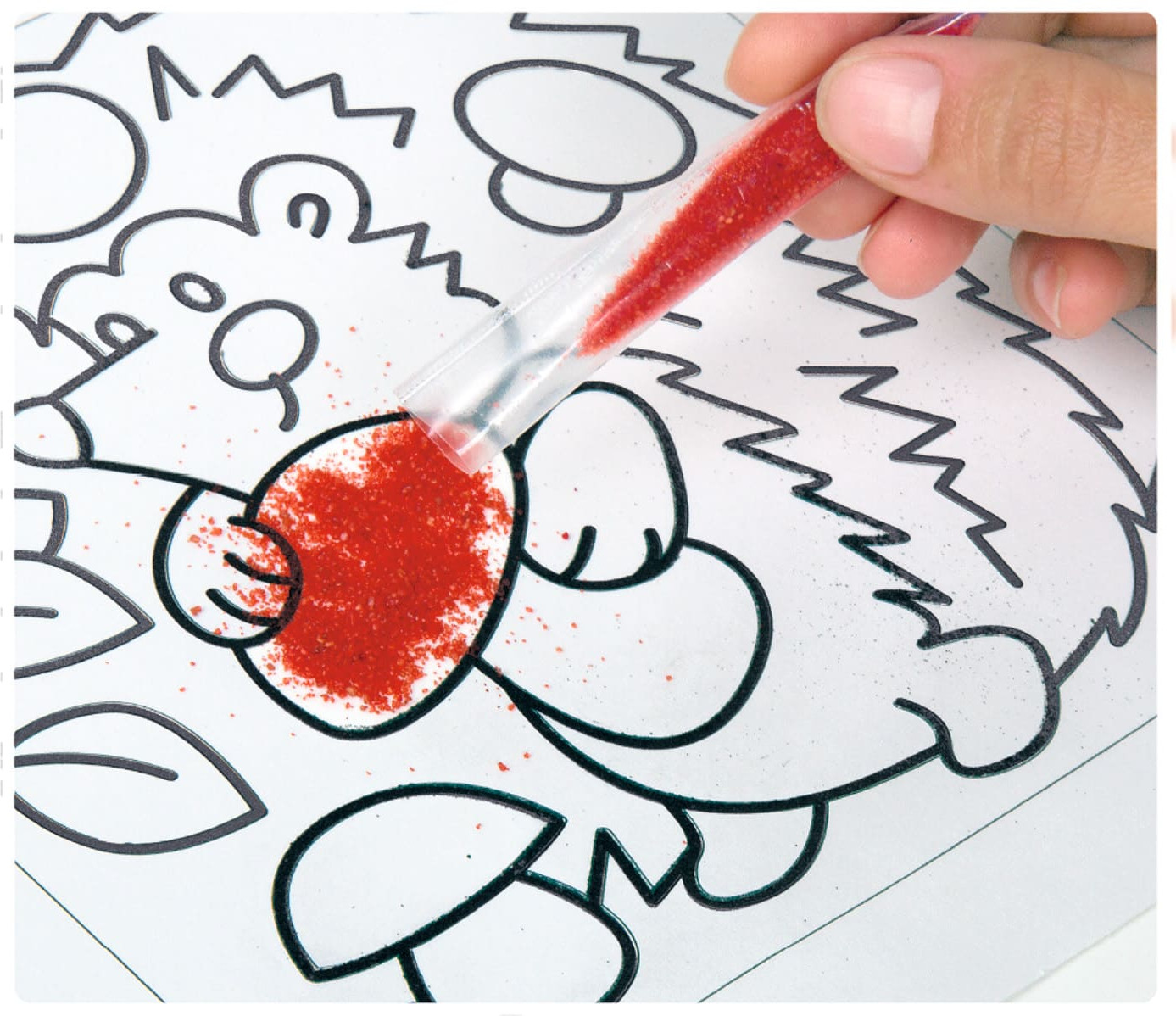 • засыпьте открытые участки песком выбранного цвета (от тёмного к светлому), старайтесь, чтобы песчинки ложились равномерно и плотно. Песочная фреска станет прекрасным украшением детской комнаты или же отличным подарком друзьям!