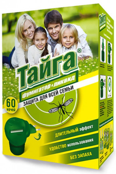 Тайга комплект: фумигатор + жидкостной наполнитель от комаров надежно защитит ваш дом от комаров. Набор укомплектован жидкостным наполнителем длительностью 60 ночей, а также универсальным прибором, который подойдет и для использования пластин от комаров. |