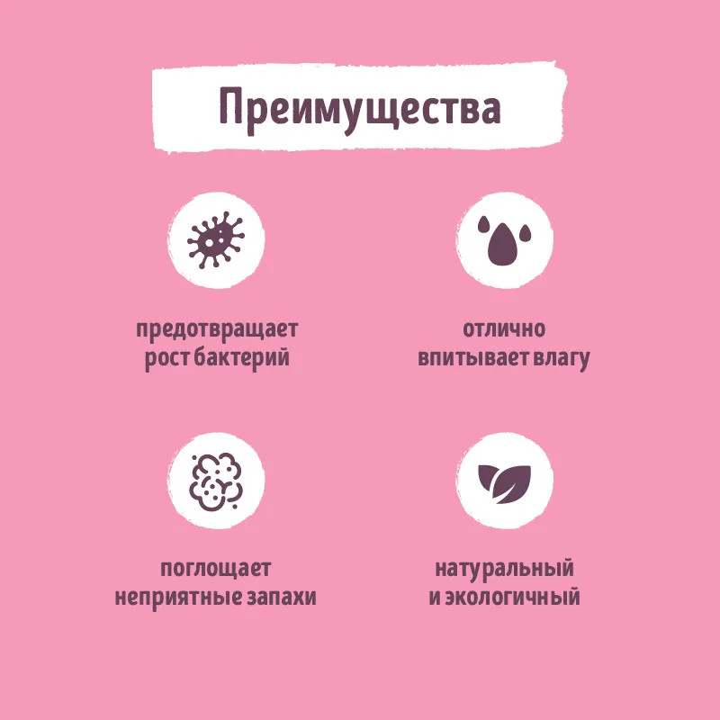 Впитывающий наполнитель на основе природного минерала диатомита — горной породы, состоящей из останков диатомовых водорослей. Он надежно удерживает жидкость и предотвращает появление неприятного запаха, а так же обладает антиаллергенными свойствами.