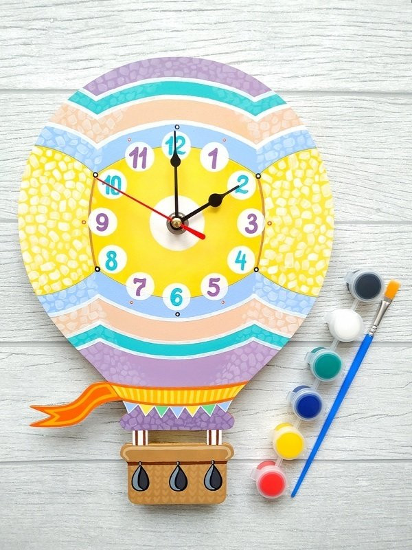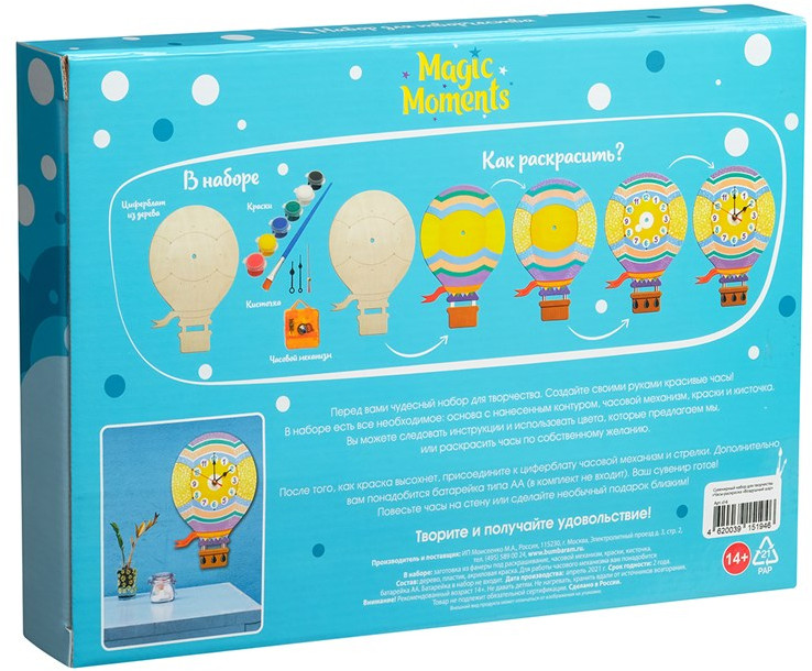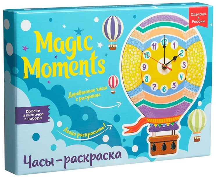 Magic Moments Набор для творчества «Часы-раскраска. Воздушный шар»В данный момент этот товар отсутствует в продаже. Возможно, у нас найдется аналогичный или похожий товар здесь. Серия: Magic Moments Чудесный набор для творчества порадует всех поклонников приключений! С его помощью вы сможете создать красивые настенные часы в авторском дизайне. В наборе вы найдете деревянную заготовку с нанесенным контурным рисунком, палитру красок с кисточкой, часовой механизм плавного хода и стрелки. Декор будущих часов можно скопировать из пошаговой инструкции по раскрашиванию или придумать самому. |