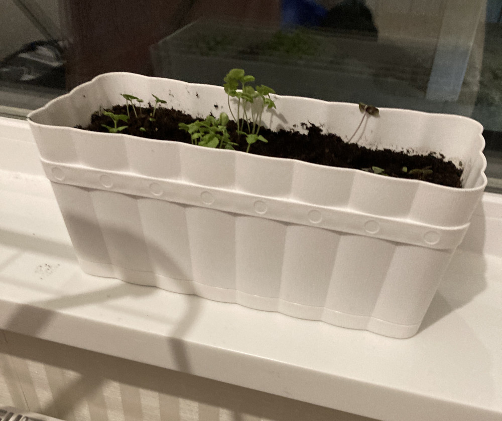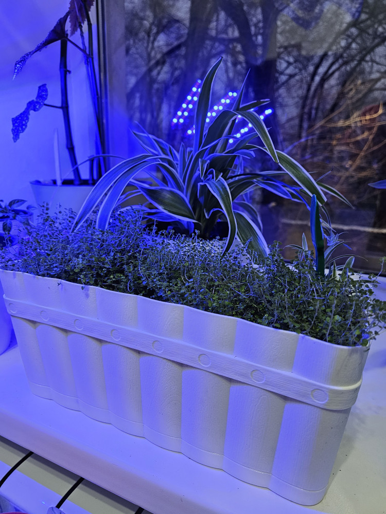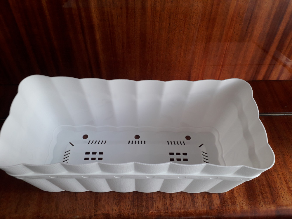 Очень отличный горшок для посадки. Можно поставить на узкий подоконник. Качественный пластик, белого цвета. Можно посадить базилик, салат.