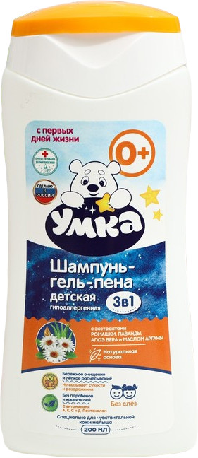 УМка Шампунь-гель-пена детский с экстрактами ромашки, лаванды, алоэ вера и маслом арганыВ данный момент этот товар отсутствует в продаже. Возможно, у нас найдется аналогичный или похожий товар здесь. Средство 3 в 1 создано специально для бережного очищения детской кожи и волос. Формула без слёз защищает глазки малыша от раздражения. Подходит для чувствительной детской кожи. Натуральные экстракты ромашки и алоэ, масло арганы, а также комплекс витаминов оказывают антисептическое, противовоспалительное и успокаивающее действие, бережно увлажняют, смягчают, питают и восстанавливают кожу и волосы. |