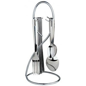 Набор столовых приборов стильно смотрится на кухне. Стойка в оригинальной форме, напоминает лебедя. Хорошо было бы написать и название бренда на самом наборе
