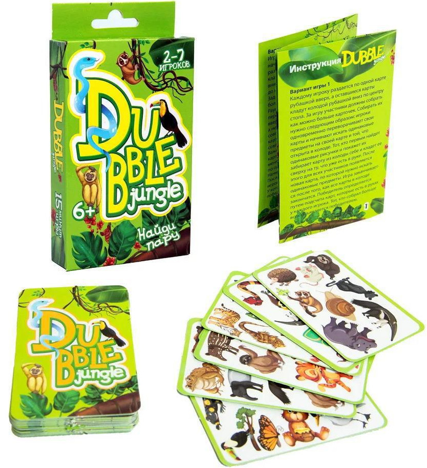 💳 Оплатить за товар можно при получении 🇰🇿 Есть бесплатная доставка по Казахстану 🎁 Копите бонусы с каждой покупки Карточная игра «Dubble jungle» «Dubble jungle» — активная карточная игра на поиск совпадений. Детям необходимо сравнивать свою карту с остальными картами и быстрее других игроков находить одинаковые рисунки на них. Победителем становится тот, кто соберет больше всех карт с совпадениями. В этой игре придется задействовать всю свою внимательность, ловкость и память, поэтому веселое занятие превращается в настоящую тренировку.«Dubble jungle» очень компактная, поэтому ее можно брать с собой куда угодно. |