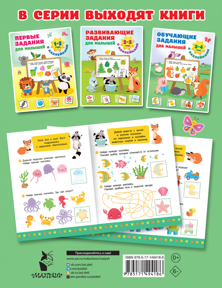 Серия: Первые занятия с наклейками «Обучающие задания для малышей. 3-4 года» — иллюстрированные развивающие игры с наклейками, которые помогут ребёнку расширить представления об окружающем мире, а также развить мышление, речь, внимание, память. Малыша ждёт масса увлекательных заданий, он сможет сам подобрать место для каждой наклейки. Игры с наклейками тренируют мелкую моторику, координацию движений, пространственное мышление, наблюдательность. А на последней странице бонус — пазлы-наклейки, из которых малыш сложит картинку. |
