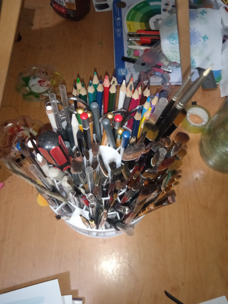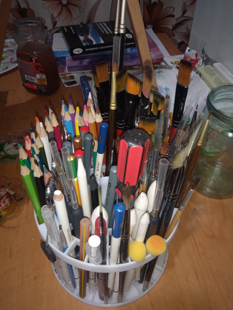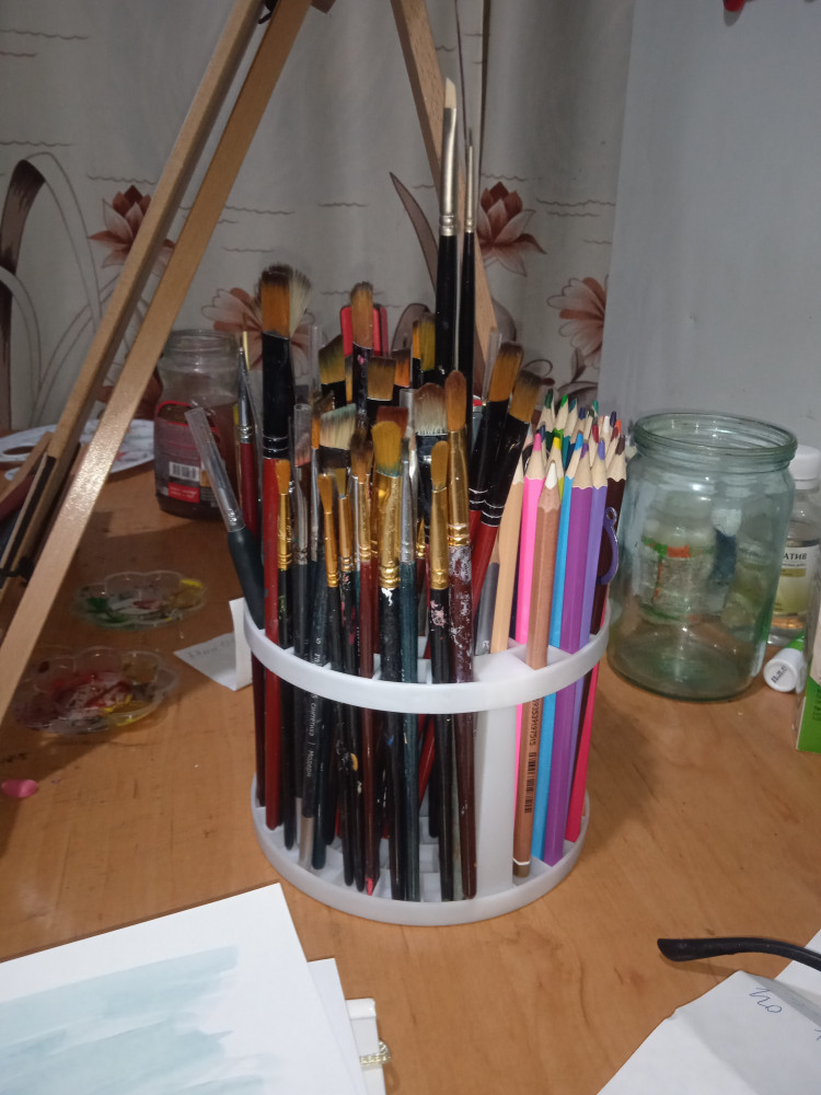 Хорошая подставка для кистей. Но мы, если честно, в итоге ей не пользуемся. Хороша для нас только в процессе рисования, чтобы не класть мокрые кисти на стол. Но ей привычнее всё же класть их😅
