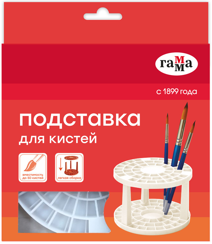 Подставка Гамма предназначена для размещения, аккуратного хранения кистей и других инструментов для творчества. Позволяет компактно разместить большое количество различных кистей одновременно до 50 шт. Сборно-разборная конструкция удобна при транспортировке и хранении. Лёгкий и прочный корпус. Размеры изделия: диаметр 145 мм, высота 100 мм.