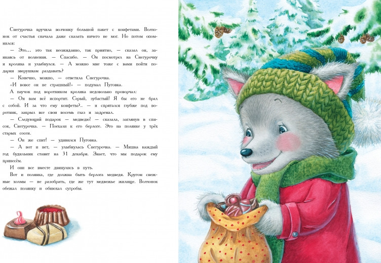 Под Новый год у Дедушки Мороза и Снегурочки очень много дел. Вот и решили они себе в помощники взять лесных зверюшек. Пока мышата и снегири с Дедом Морозом ёлку наряжали, кролик Пуговка со Снегурочкой отправились подарки развозить. Ох и нелёгкое это дело! Медведя нужно разбудить, к белкам в дупло забраться, через ледяной ручей к бобрам перейти, лисичку-плутовку догнать и чужие подарки отобрать... Всем доставили подарки Снегурочка и кролик. Опустели санки. Но где же подарок Пуговки? |