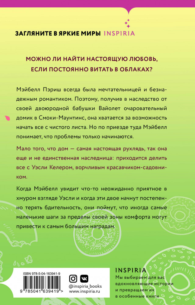 Сюжет : 7/10 Персонажи : 5/10 Оригинальность : 6/10 Общ.оценка : 6/10 📚 Мэйбелл Пэриш всегда была мечтательницей и безнадежным романтиком. Поэтому, получив в наследство от своей двоюродной бабушки Вайолет очаровательный домик в Смоки-Маунтинс, она хватается за возможность начать все с чистого листа. Но по приезде туда Мэйбелл понимает, что проблемы только начинаются. 🍎 Ну,что же я могу сказать о романе за 700 тенге ? Да , собственно ничего Слог - легкий,читается безумно быстро и особой смысловой нагрузки нет,да и быть ее не должно.Персонажей в жизни представить могу,второстепенных как Джемма или Кристин особенно. Вообще,в книге троп от незнакомцев до любви.Но,угар в том,что ЖГГ каждую ночь представляла МГГ,тк «встречалась» с его фоткой.И встреча в реальной жизни была ударом под дых. История сама по себе моментами смешная,неловкая.Думаю,я даже недооценила ее,поэтому вам стоит самим прочитать ее.