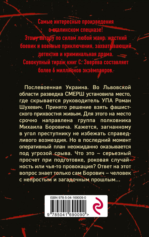 В данный момент этот товар отсутствует в продаже. Возможно, у нас найдется аналогичный или похожий товар здесь. Серия: Солдаты СМЕРШ. Романы о неизвестных боях (обложка) Самые интересные произведения о сталинском спецназе! Этому автору по силам любой жанр: жесткий боевик и военные приключения, захватывающий детектив и криминальная драма. Совокупный тираж книг С. Зверева составляет более 6 миллионов экземпляров.