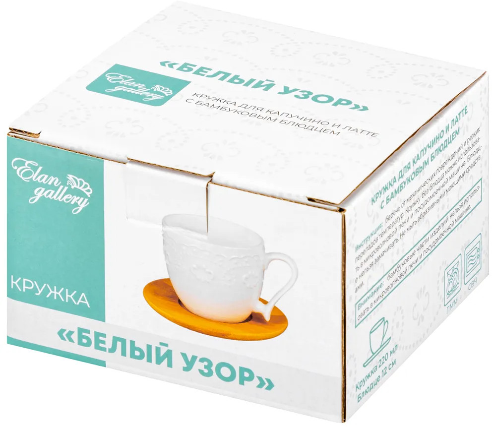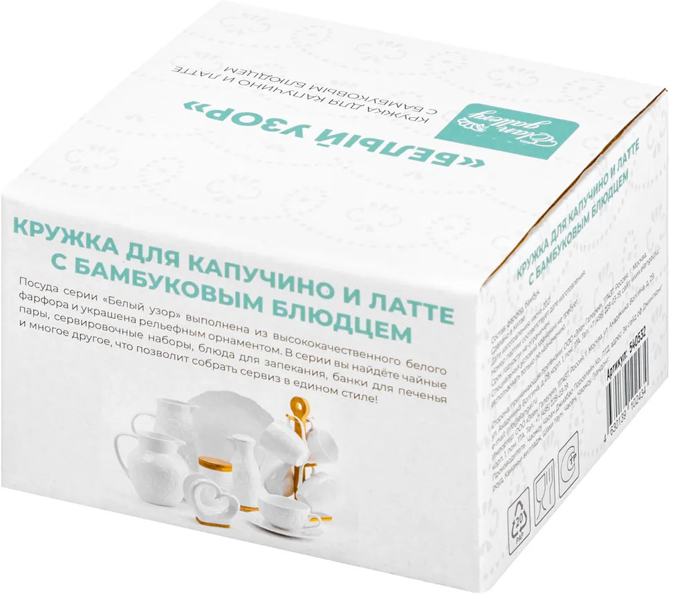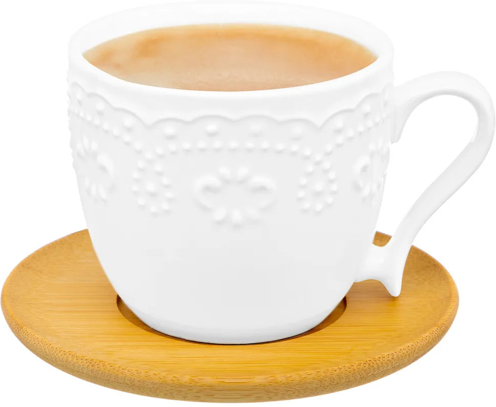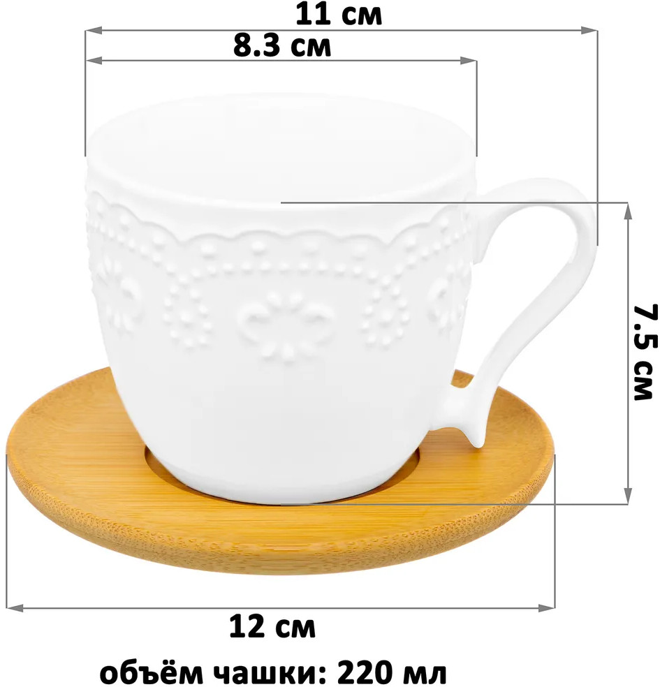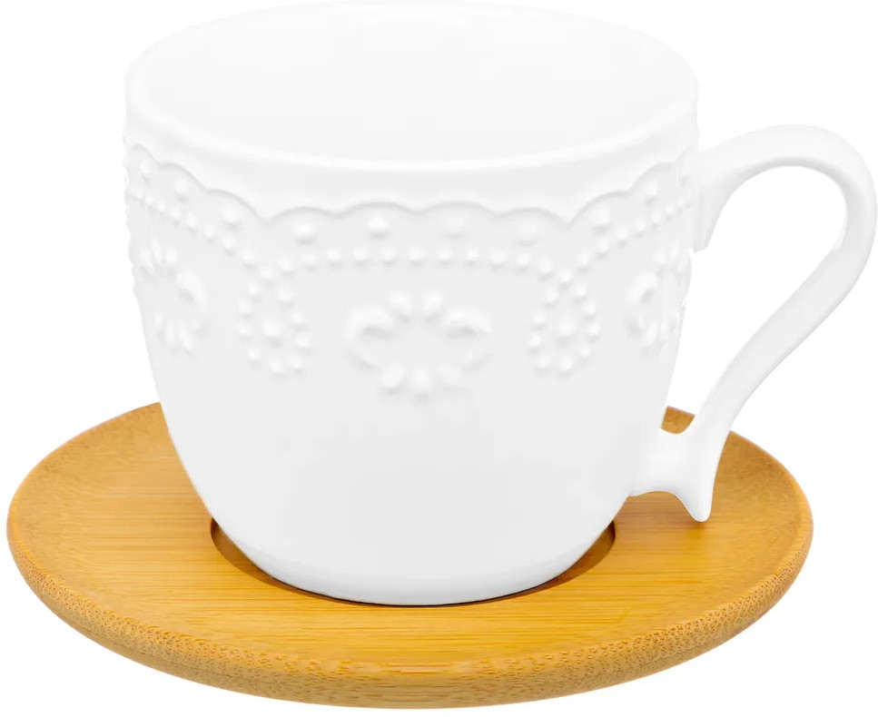 Чашка серии «Белый узор» с бамбуковой подставкой поможет провести множество вкусных завтраков с капучино или латте, а также уютных вечеров с любимым горячим напитком. Чашка выполнена из высококачественного белого фарфора и украшена декоративными рельефными узорами. Фарфоровые чашки отличаются от керамических повышенной плотностью. Они не впитывают цвет кофе, чая, глинтвейна, других горячих напитков и не деформируются от влаги, чему может быть подвержена керамика.
