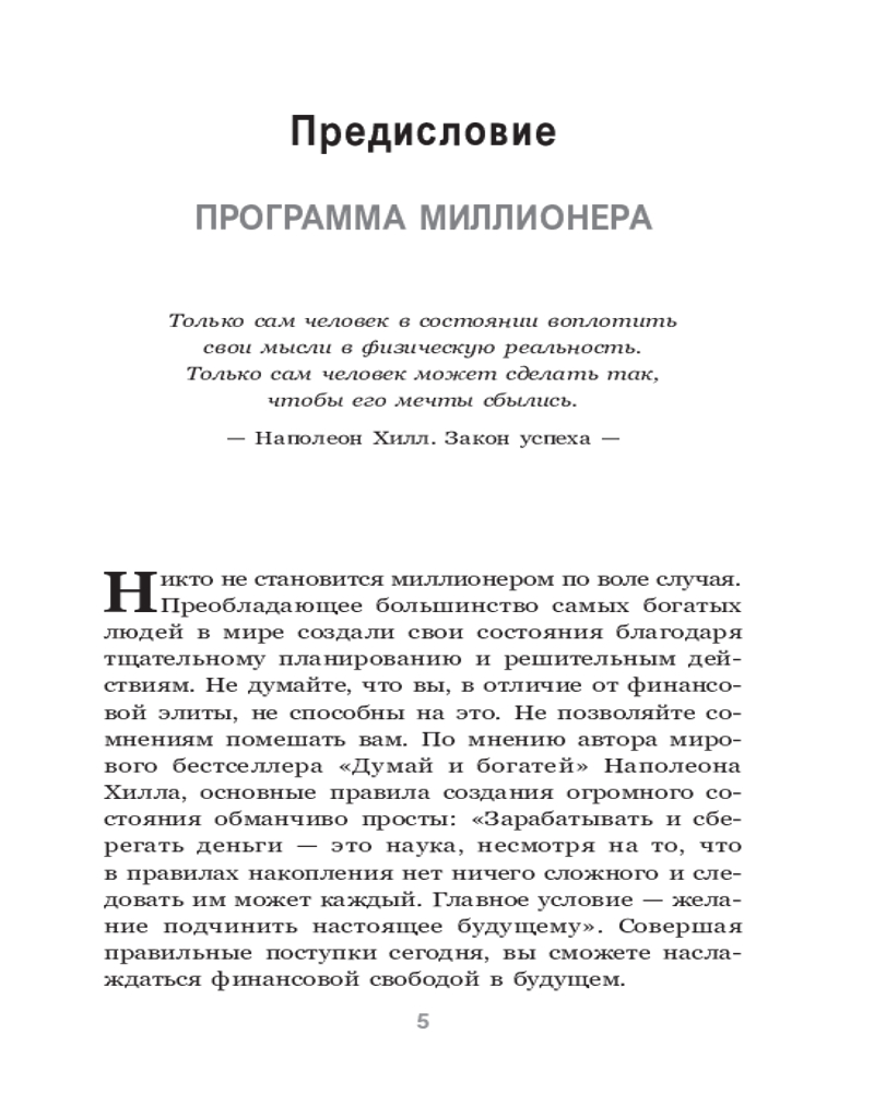 Миллионерами не становятся случайно — накопление благосостояния требует тщательного планирования и решительных действий. Но денежные принципы, используемые финансовой элитой, не выходят за рамки понимания среднестатистического человека — любой действительно может думать и богатеть! Эта книга не только изменит ваше мышление, но и научит привычкам, необходимым для достижения финансовой свободы.