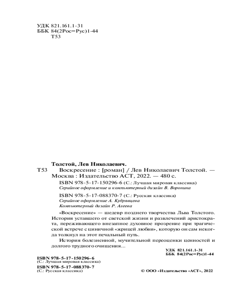 Серия: Лучшая мировая классика «Воскресение» — шедевр позднего творчества Льва Толстого. История уставшего от светской жизни и развлечений аристократа, переживающего внезапное духовное прозрение при трагической встрече с циничной «жрицей любви», которую он сам некогда толкнул на этот печальный путь. |