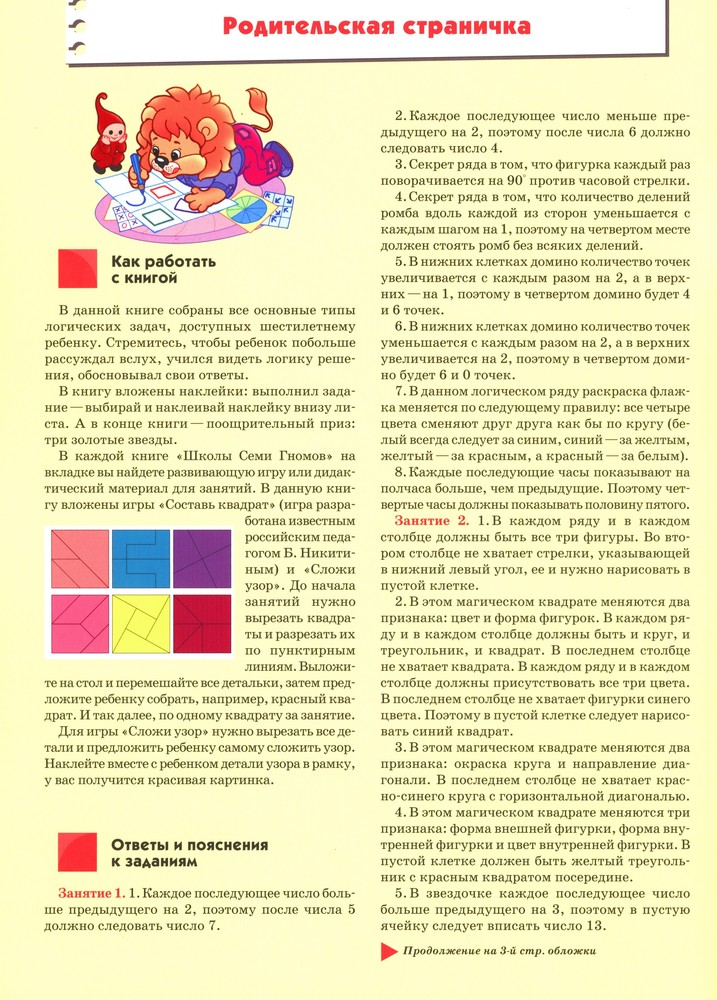Логика, мышление. Для занятий с детьми от 6 до 7 летВ данный момент этот товар отсутствует в продаже. Возможно, у нас найдется аналогичный или похожий товар здесь. Серия: Школа Семи Гномов «Школа Семи Гномов» — это комплексная система занятий с ребенком от рождения до поступления в школу, по 12 красочных развивающих пособий на каждый год жизни |