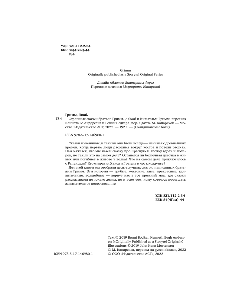 Страшные сказки братьев ГриммЯкоб и Вильгельм Гримм, Бенни Бёкер, Кеннет Бег Андерсен В данный момент этот товар отсутствует в продаже. Возможно, у нас найдется аналогичный или похожий товар здесь. Серия: Скандинавские боги Сказки изменчивы, и такими они были всегда — начиная с древнейших времен, когда первые люди расселись вокруг костра и повели рассказ. Нам кажется, что мы знаем сказку про Красную Шапочку вдоль и поперек, но так ли это на самом деле? Останется ли беспечная девочка в живых или погибнет в животе у волка? Что на самом деле приключилось с Рапунцель? Кто отправил Ханса и Гретель в лес к колдунье? |