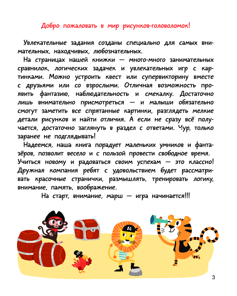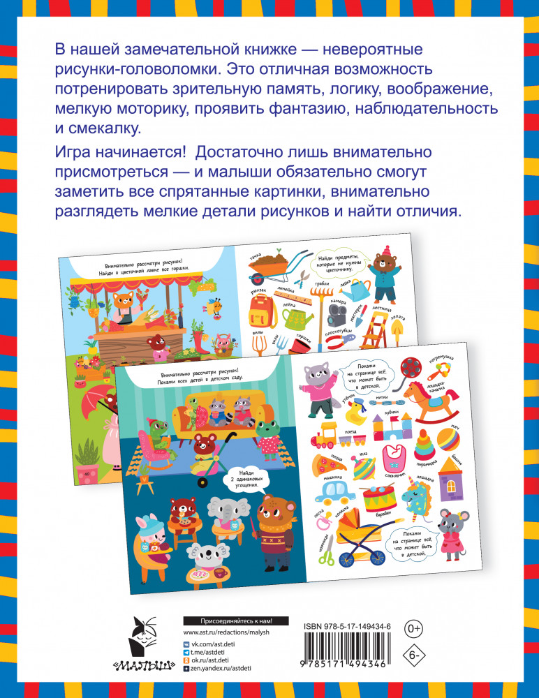 Серия: Первые активити-книжки Книжка с цветными картинками «Найди и сравни» — отличная возможность потренировать логику, воображение, мелкую моторику, проявить фантазию, наблюдательность и смекалку. Так здорово посоревноваться, кто быстрее справится с игровыми заданиями: ребята с удовольствием отправятся на поиски спрятанных картинок, будут решать логические задачки, внимательно разглядывать мелкие детали рисунков и находить отличия. |