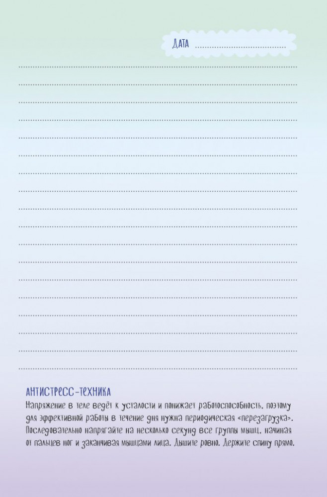 Кроме того, вы найдёте тематические списки, которые сможете заполнить названиями своих любимых книг, фильмов, музыкальных композиций, заветных желаний и ваших личных «мест силы». Плотные страницы для записей, удобная линовка в линейку, классический формат — всё это позволит пользоваться недатированным ежедневником с удовольствием.