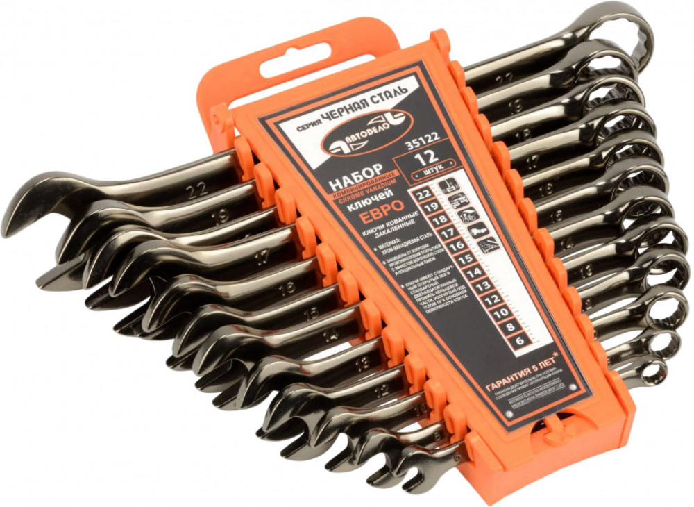Набор комбинированных ключей АвтоDело применяется для работы с крепежом различных размеров при ремонте автомобиля или в бытовых условиях. Ключи изготовлены из хром-ванадиевой стали методом горячей штамповки при пониженной температуре заготовки. Имеют стандартный открытый зев и кольцевую часть с рабочим профилем Over Drive. Рабочие профили имеют повышенную точность. Термически обработаны до твёрдости 39-41 HRC.