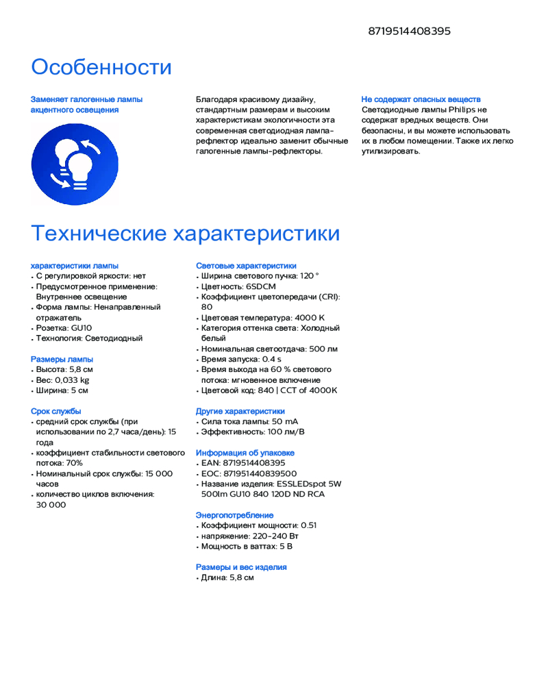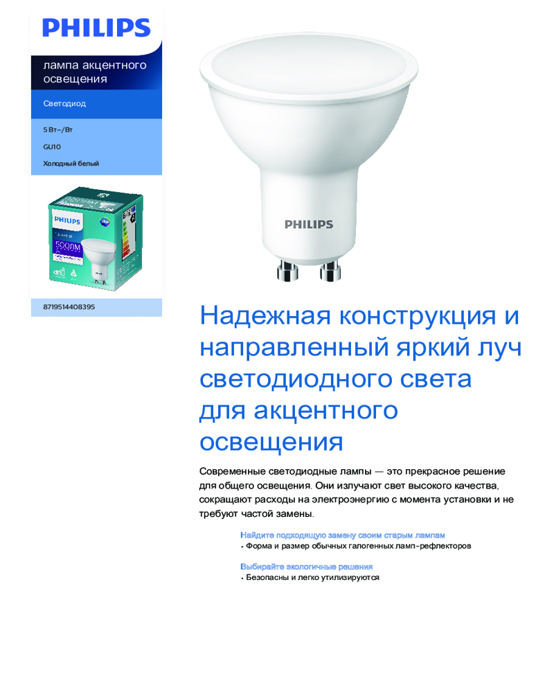 Современные светодиодные лампы — это прекрасное решение для общего освещения. Они излучают свет высокого качества, сокращают расходы на электроэнергию с момента установки и не требуют частой замены. Благодаря красивому дизайну, стандартным размерам и высоким характеристикам экологичности эта современная светодиодная лампа-рефлектор идеально заменит обычные галогенные лампы-рефлекторы. Светодиодные лампы Philips не содержат вредных веществ. Они безопасны, и вы можете использовать их в любом помещении. Также их легко утилизировать.