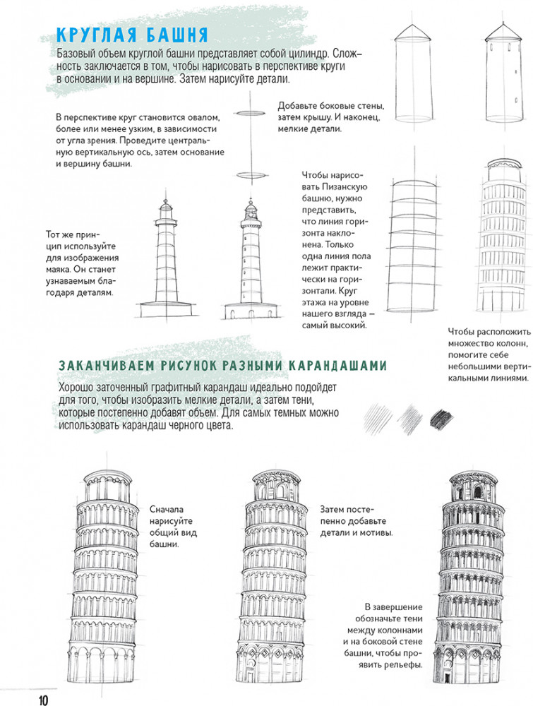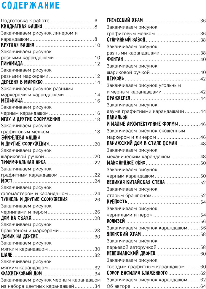 В этом скетчбуке вас ждут мастер-классы по рисованию зданий и построек: домов, дворцов, башен, пирамид, замков и т. д. Для простоты и наглядности автор разбивает каждое строение на простые формы и объемы, а затем с помощью различных приемов светотени и перспективы, а также разнообразных принадлежностей, дополняет деталями базовую структуру, превращая на наших глазах несколько объемных геометрических форм, к примеру, в... собор Василия Блаженного!