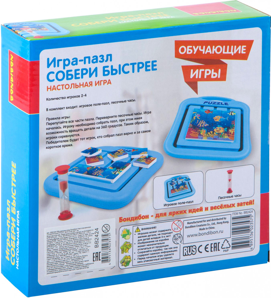 Bondibon Игра настольная «Собери быстрее»В данный момент этот товар отсутствует в продаже. Возможно, у нас найдется аналогичный или похожий товар здесь. Серия: Обучающие игры Вращающийся пазл изменит представление о головоломках, ведь каждый элемент пазла может вращаться на 360 градусов! Перепутайте все части пазла, переверните песочные часы. Игра началась. Игрок должен собрать пазл, который можно вращать на 360 градусов. Кто собрал за самое короткое время, победил! |