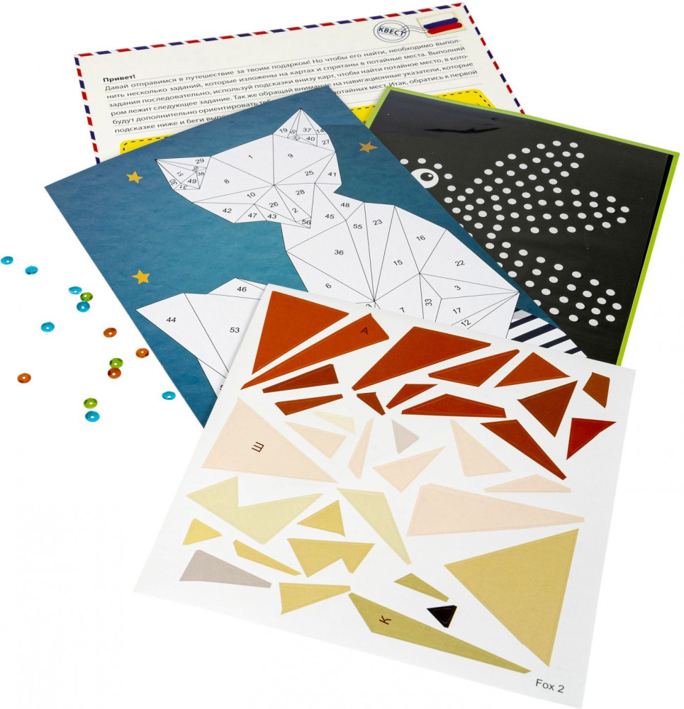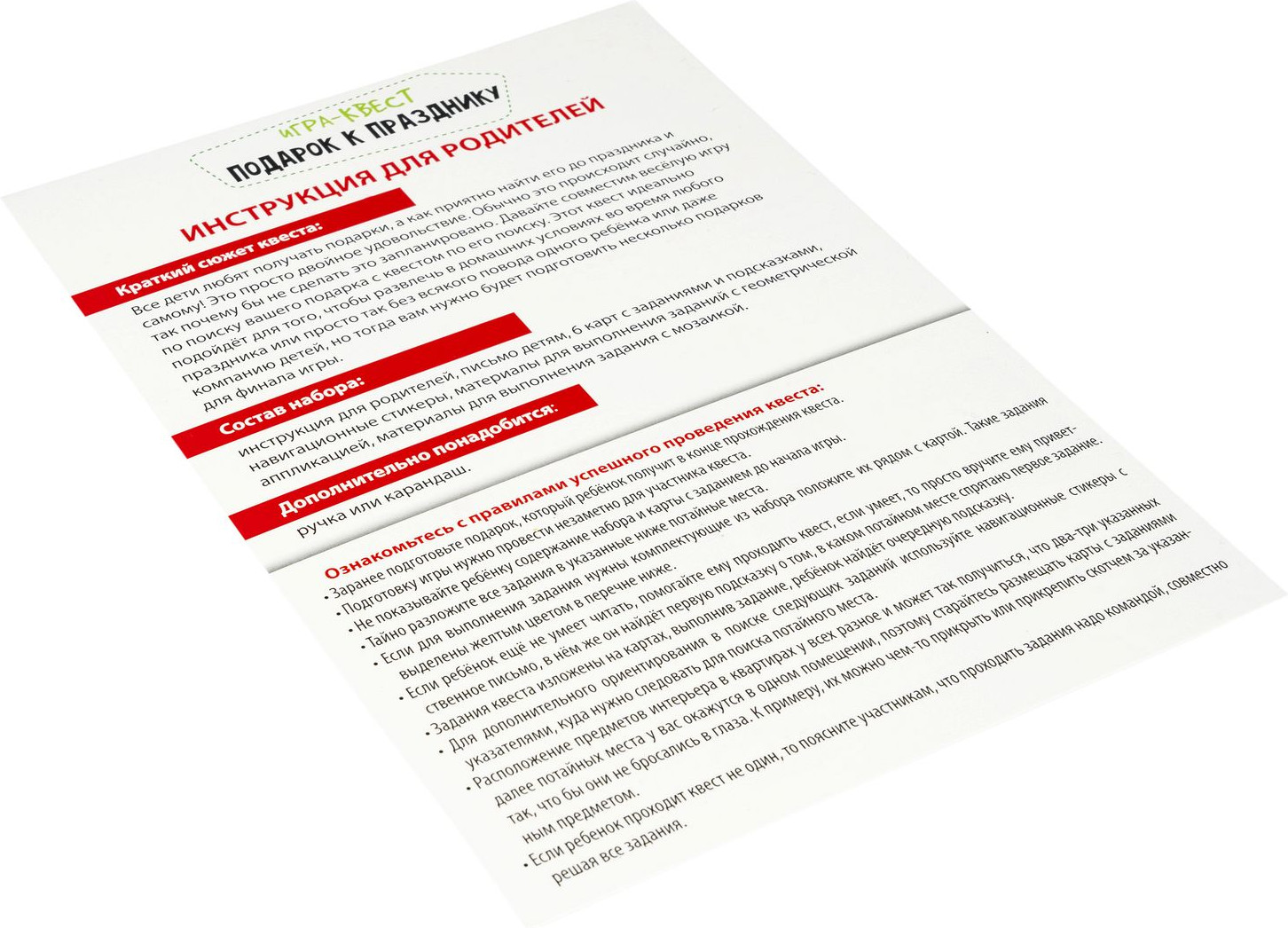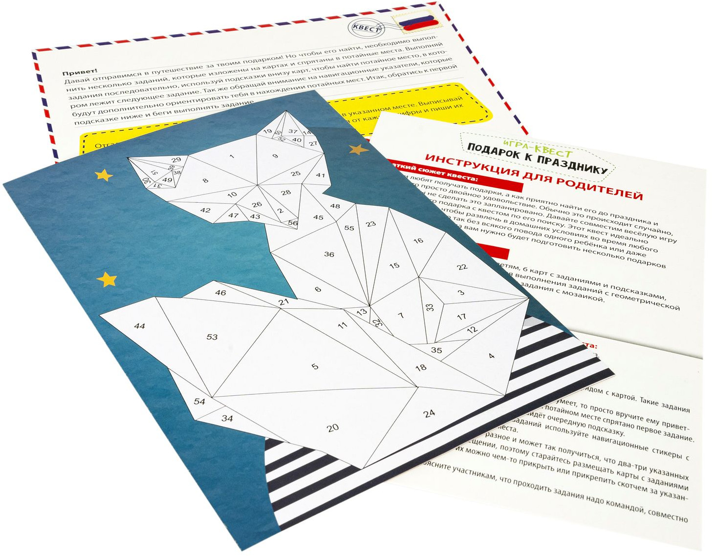 В комплекте: инструкция для родителей, письмо детям, 6 карт с заданиями и подсказками, стикеры, материалы для выполнения заданий с аппликацией и мозаикой.