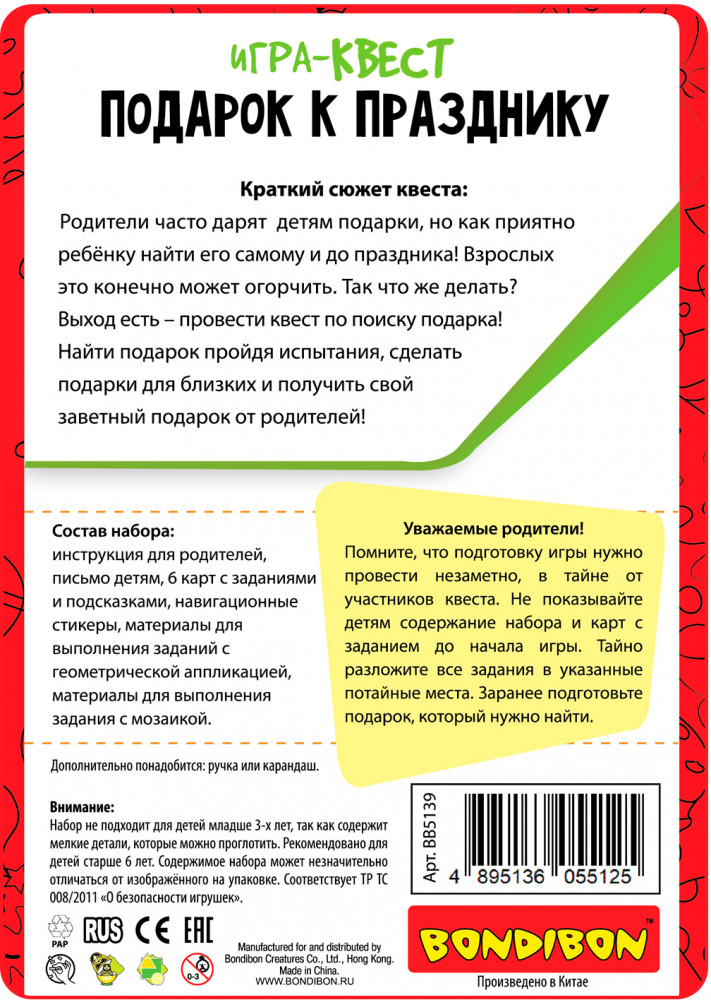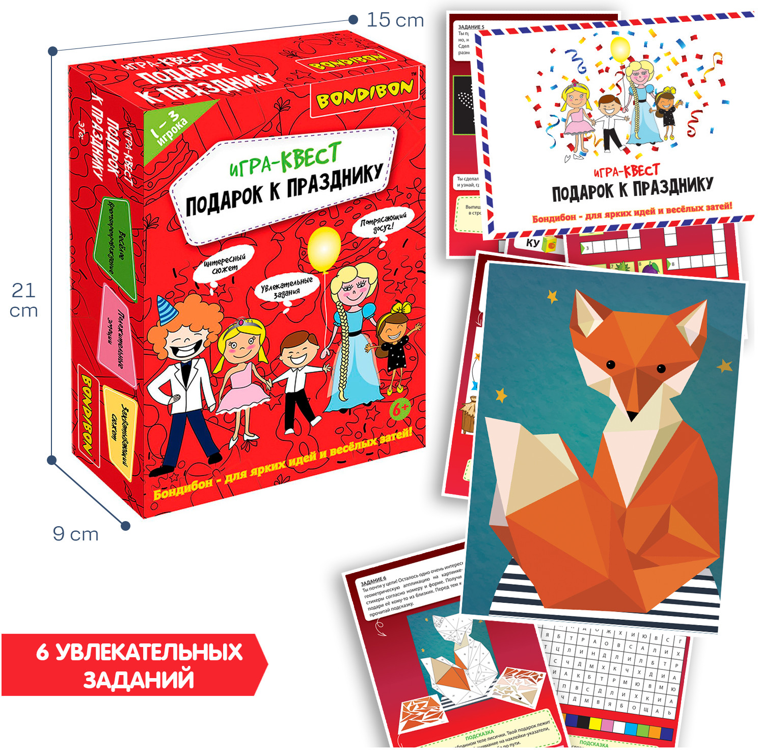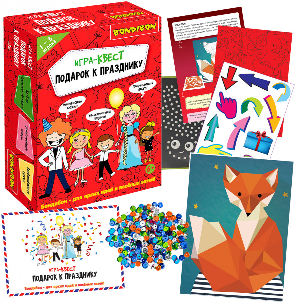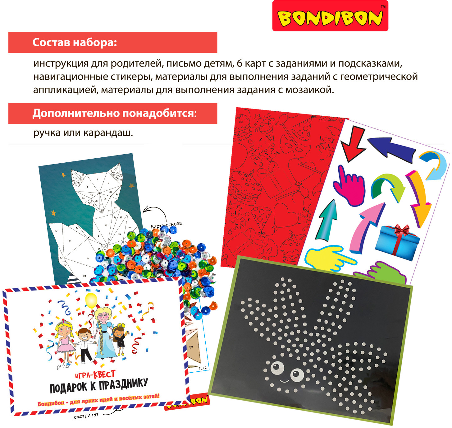 Как подарить ребенку подарок к празднику, чтобы это было ярко и запоминающе? Устройте интересную и веселую игру-квест по поиску подарка вместе с Bondibon. Все задания квеста не только увлекательные, но и познавательные. В процессе игры активно развивается логическое мышление, внимание и моторика.