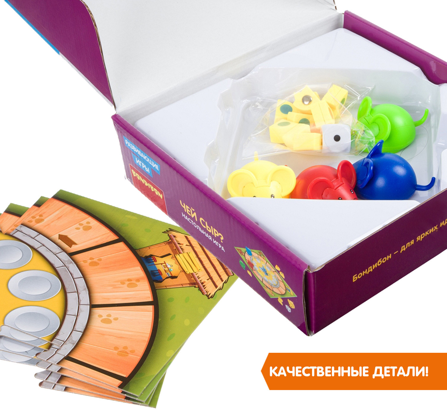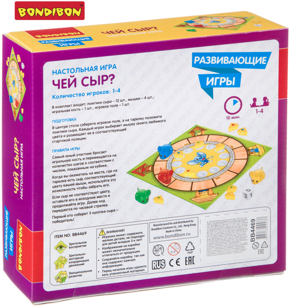 Bondibon Игра настольная «Чей сыр?»В данный момент этот товар отсутствует в продаже. Возможно, у нас найдется аналогичный или похожий товар здесь. Серия: Обучающие игры Самый юный участник бросает игральную кость и перемещается на количество шагов в соответствии с числом, показанным на кубике. Когда вы окажетесь на месте, где на тарелке есть сыр, соответствующий цвету вашей мыши, используйте эту возможность чтобы забрать его. Если сыр не соответствует цвету, оставьте его в исходном месте и продолжайте игру. Далее ход передается по часовой стрелке. Первый кто соберет 3 кусочка сыра — победитель! Игра направлена на развитие быстрой реакции, зрительно — моторной координации движения, а также укрепление концентрации внимания. Способствует социальному развитию, а также веселому и полезному времяпровождению. |