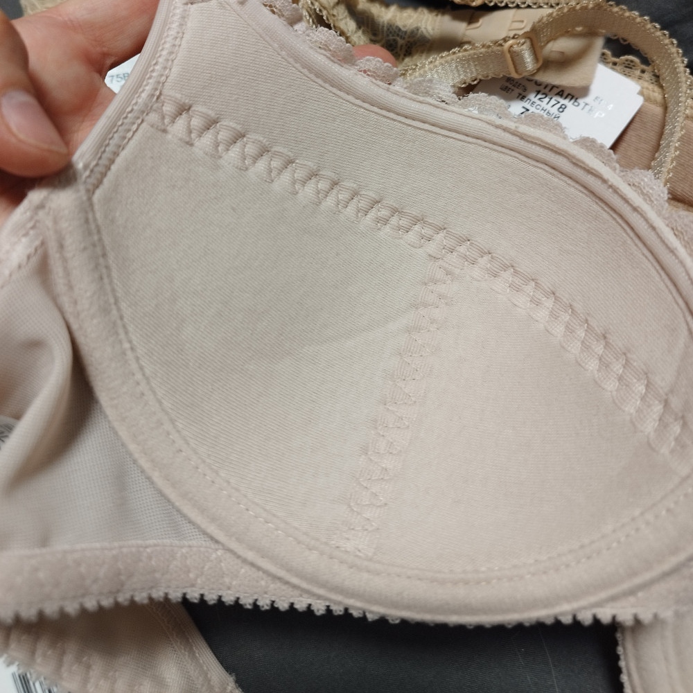 тонкий, без поролона, очень приятный. красивый цвет. у меня вообще 75 В, взяла последний 70С. в целом норм по размеру. качество прекрасное! грудь маленькая, ещё и откормившая (т.е. не айс), но село все супер и смотрится огонь!