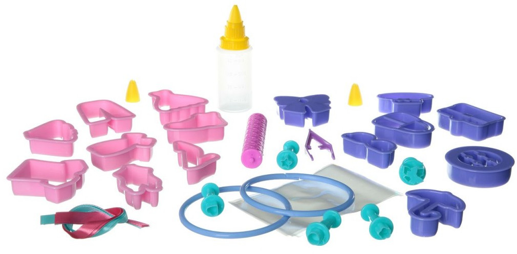 В наборе: 6 пакетиков и 6 ленточек, пинцет, бутылочка для нанесения глазури с тремя наконечниками, 15 формочек для вырезания фигурок из теста, 5 формочек для вырезания фигурок из мастики, скалка для нанесения рельефных узоров, кольца для хранения формочек, инструкция.