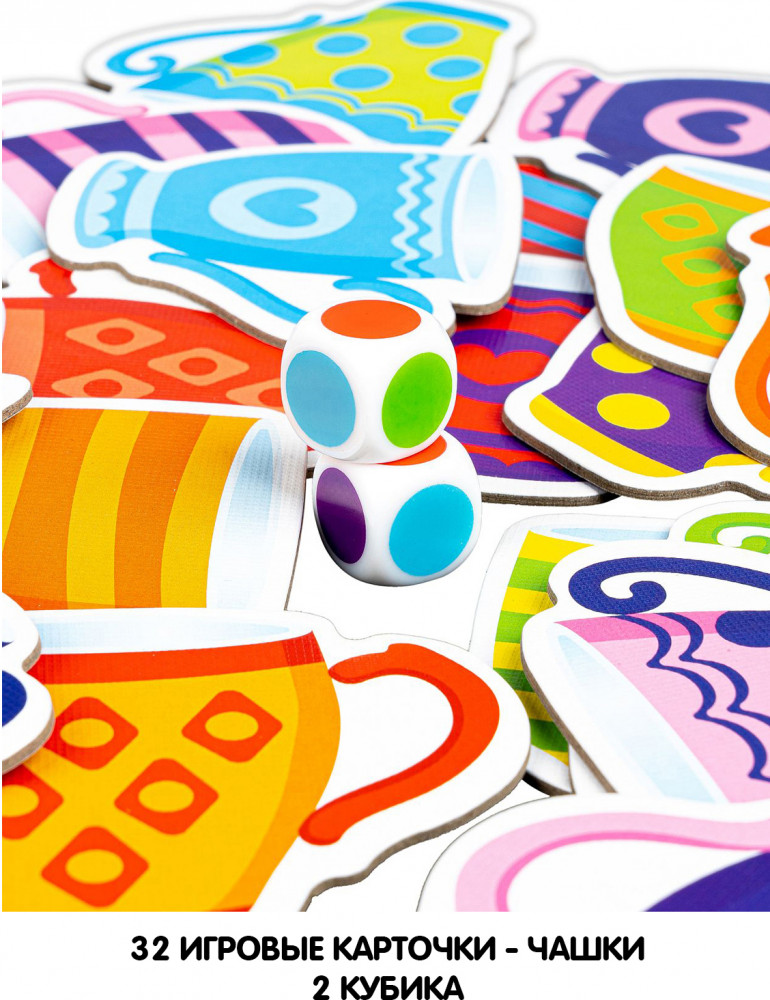 Настольная игра «Чаепитие» серии «Играй Думай Учись» от «Bondibon» направлена на закрепление представлений ребенка об основных цветах спектра, развивает зрительную память и внимание ребёнка, учит его внимательно рассматривать предметы и быстрее всех находить нужные цвета на игровых карточках. Цель игры: собрать как можно больше игровых карточек-чашек, опередив соперников.