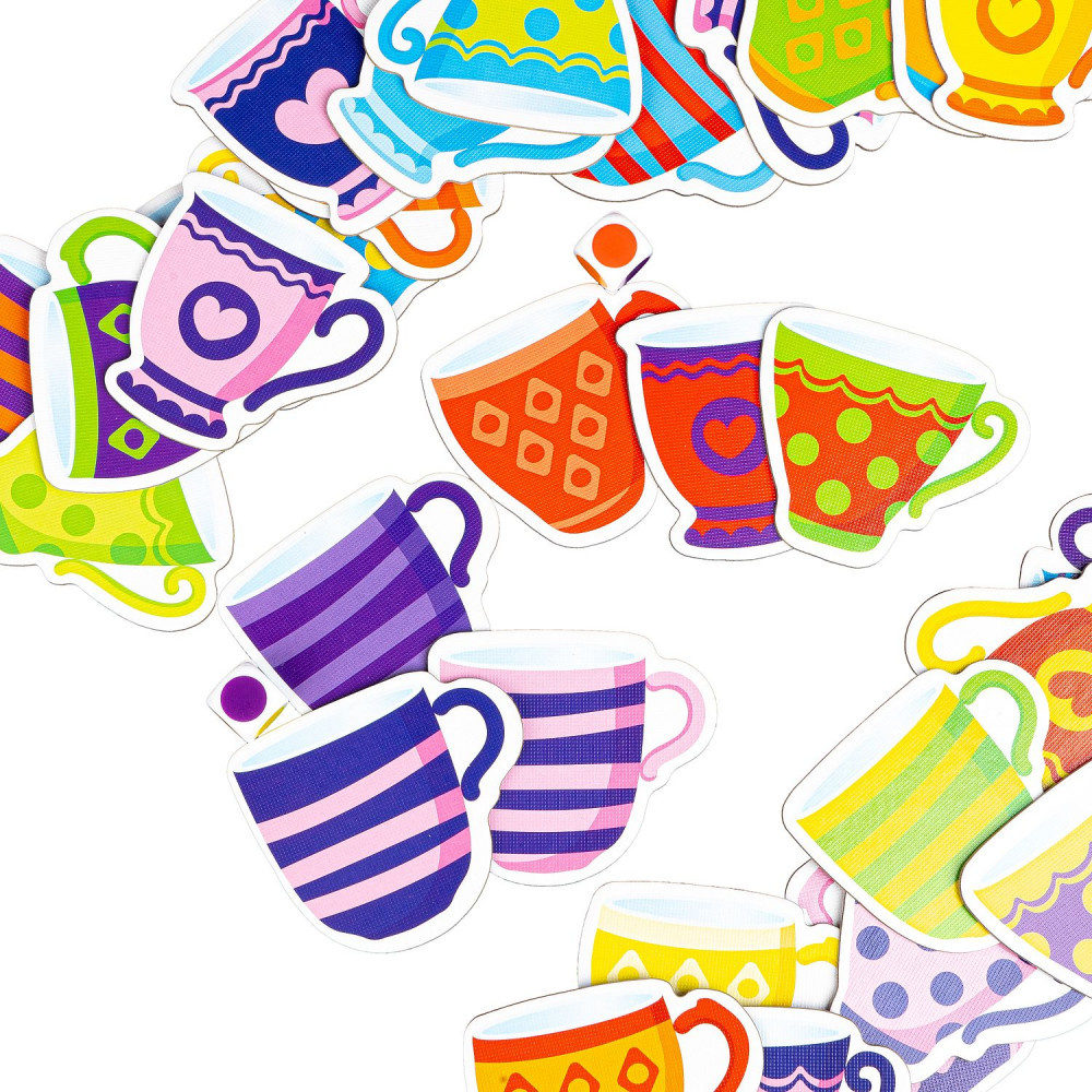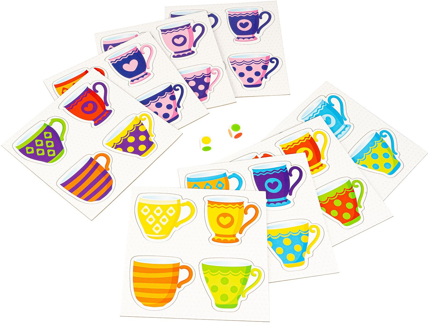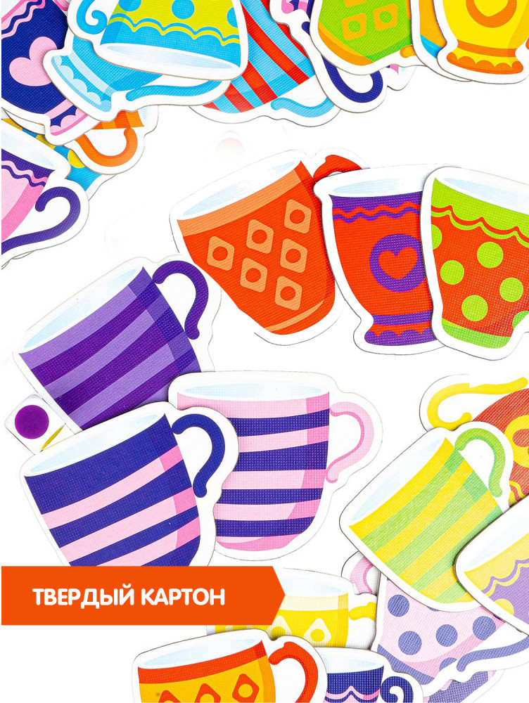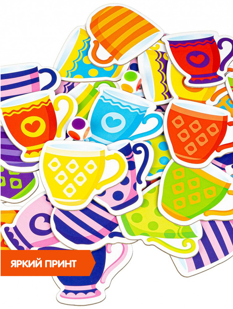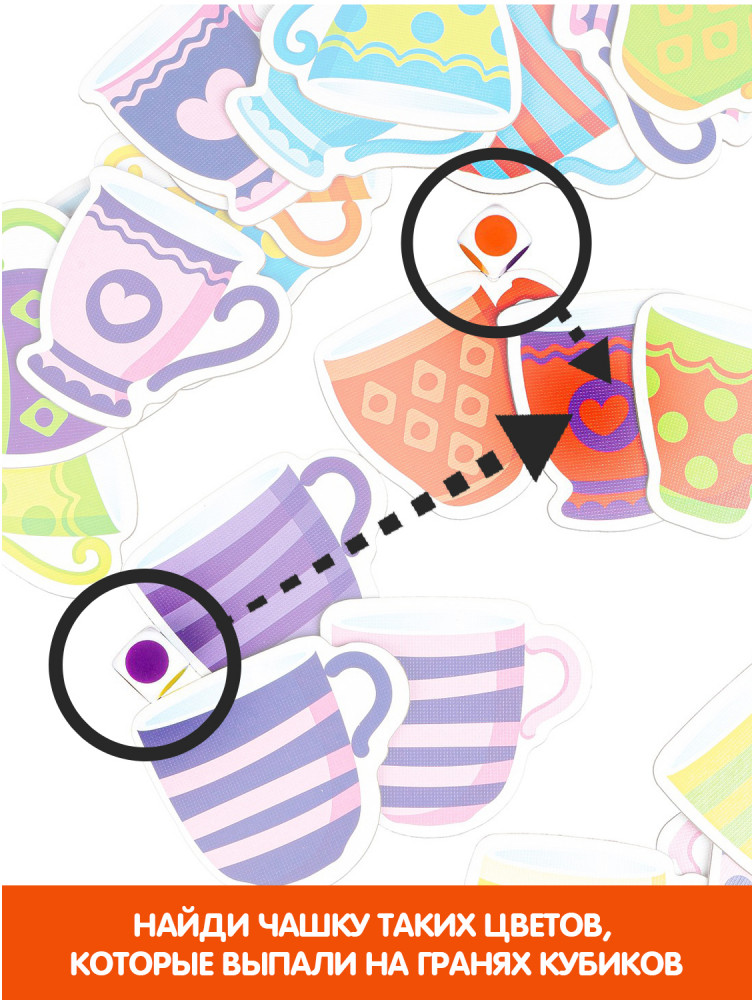 В игре участвуют от 2 до 4 игроков. Игроки стараются как можно быстрее найти чашку, окрашенную в цвета, выпавшие на верхних гранях кубиков. Но нужно быть внимательным! Если на столе не осталось больше чашек с выпавшими на гранях кубика цветами, то игрок должен быстрее всех взять джокера. Победитель тот, кто собрал наибольшее количество чашек! Он и пригласит всех своих друзей на чаепитие! Правила игры просты и надолго увлекают в игровой процесс малышей.