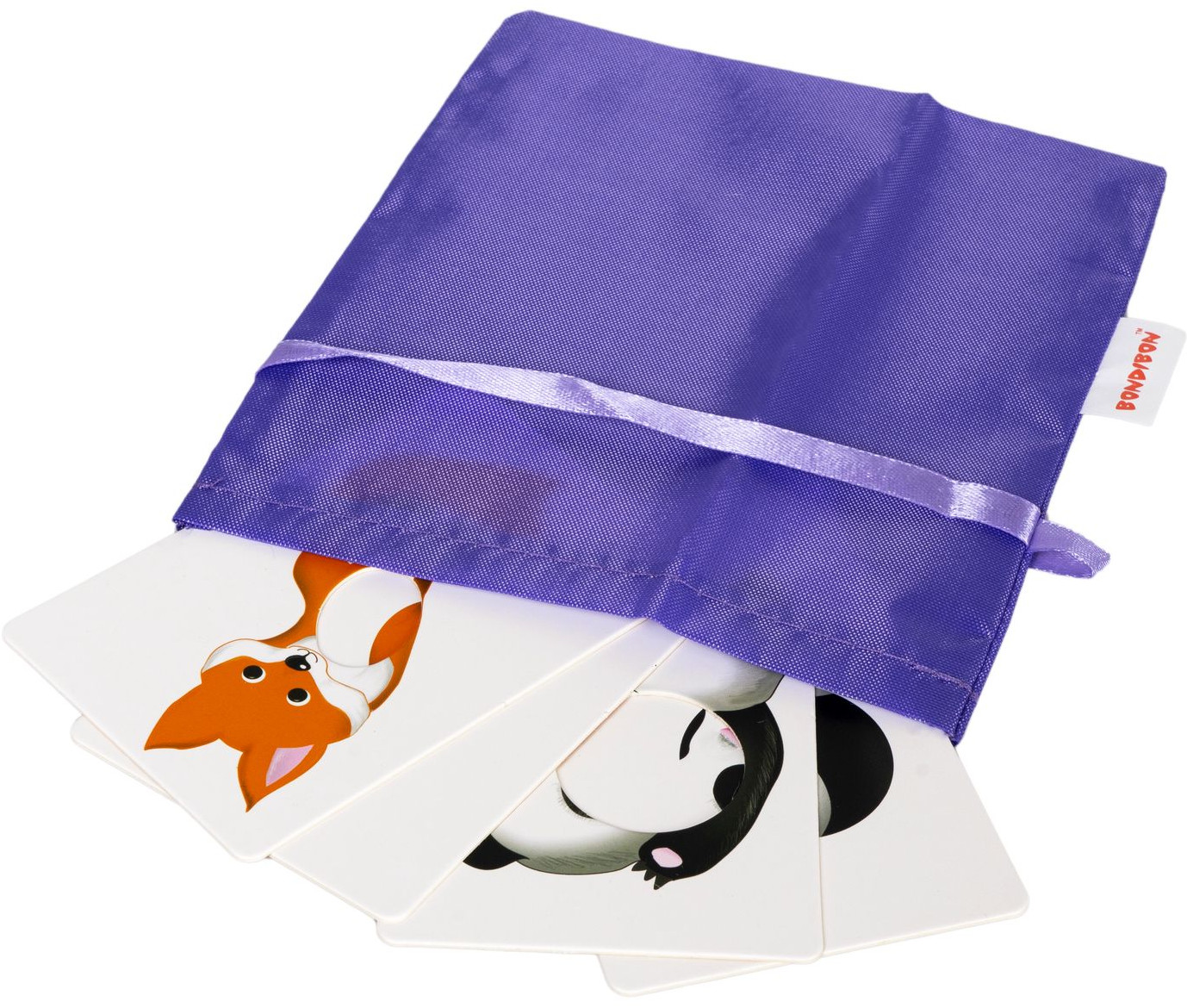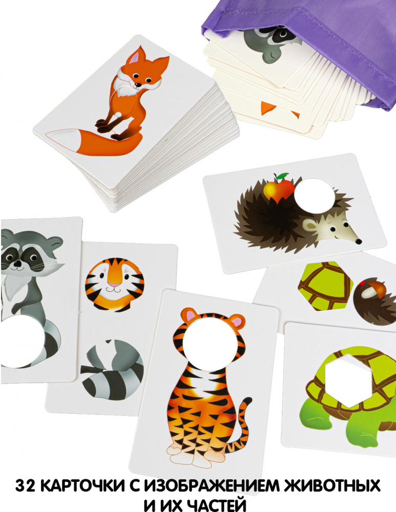 В комплекте: 18 карточек с изображением животных, 14 карточек — их части в круге, овале, шестиугольнике и звёздочке, а также тканевый мешочек, с которым игру удобно взять с собой в гости или в путешествие.