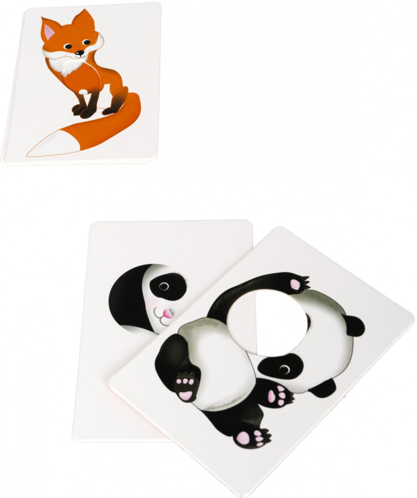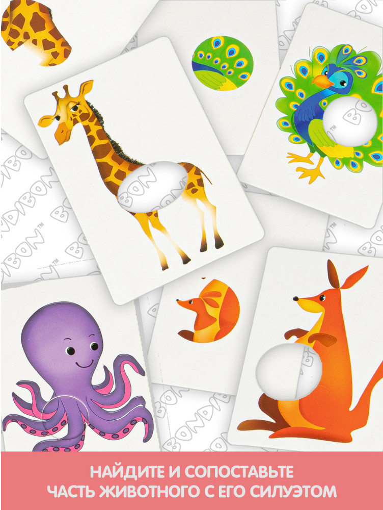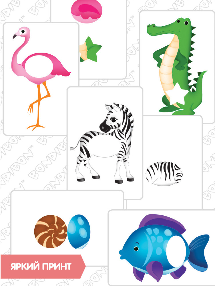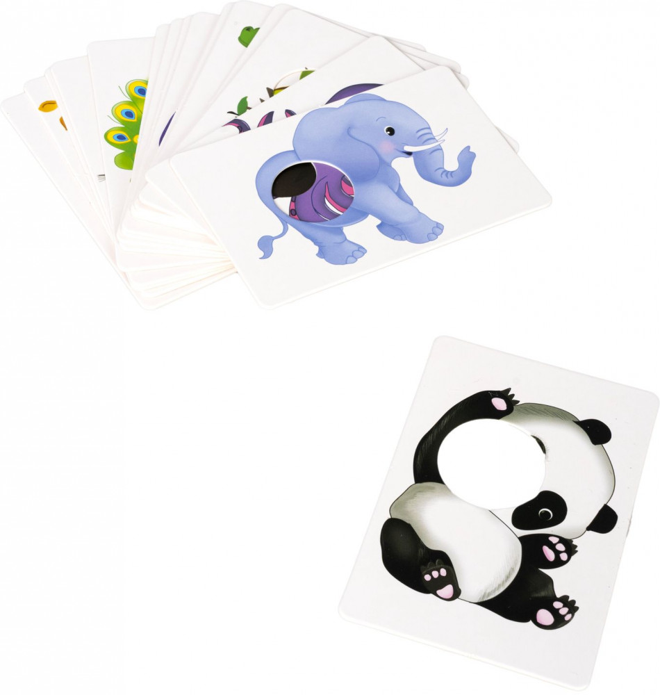 Правила игры: покажите ребёнку изображение животного и приложите карточку с изображением недостающей части. На середину игрового стола положите карточки с частями животных лицевой стороной вверх. Карточки с силуэтами животных раздайте игрокам, на каждой из этих картинок чего-то не хватает. Картинки различаются по сложности. В игре есть карточки, на которых изображены сразу две части животных, и ребёнку нужно верно составить картинку.