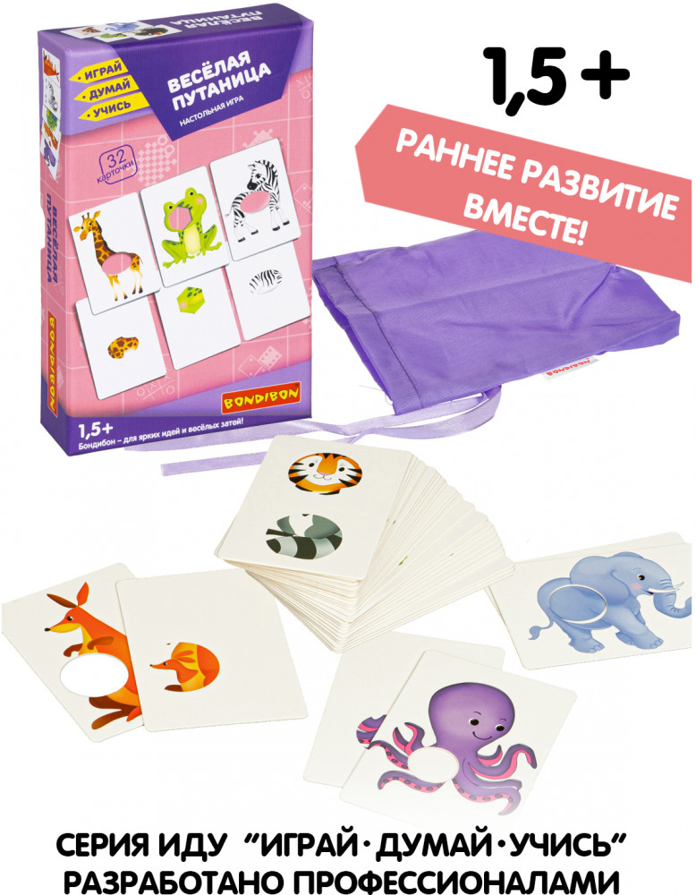 Игра настольная «Веселая путаница» серии «Играй Думай Учись» от «Bondibon» познакомит ребенка с миром животных, развивает внимание, цветовосприятие, закрепляет знание геометрических фигур.