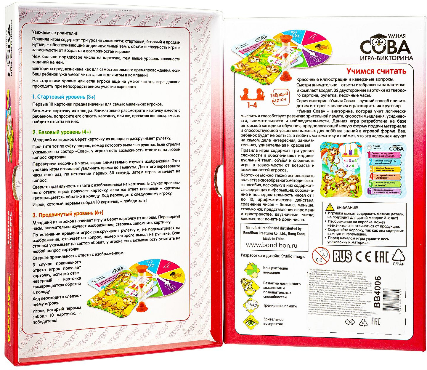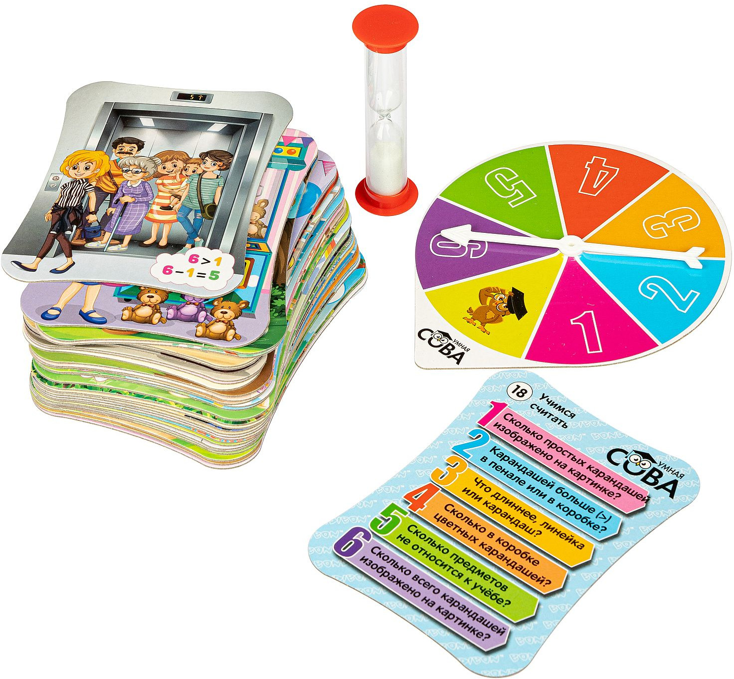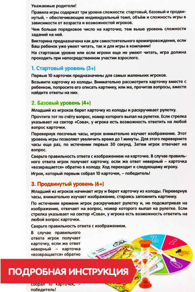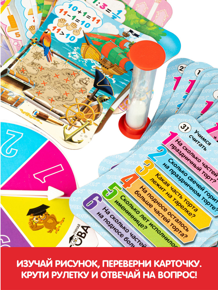 💳 Оплатить за товар можно при получении 🇰🇿 Есть бесплатная доставка по Казахстану 🎁 Копите бонусы с каждой покупки Серия: Умная сова «Умная Сова» — викторина, которая учит логически мыслить и способствует развитию зрительной памяти, скорости мышления, усидчивости, внимательности и наблюдательности. Данная игра разработана на базе авторской методики обучения, предполагающей новую форму подачи материала и способствующей усвоению важных для ребёнка знаний в игровой форме. Ваш ребенок будет не бояться, а любить математику и поймет, что эта «сложная наука» на самом деле интересная, занимательная, удивительная и красивая! Правила игры содержат три уровня сложности и обеспечивают индивидуальный темп, объём и сложность игры в зависимости от возраста и возможностей игроков. Карточки можно также использовать в качестве своеобразного методического пособия, поскольку в них содержится следующая информация: обозначение и последовательность чисел от 1 до 10; арифметические действия; сравнение чисел — больше, меньше, столько же; представления о времени и пространстве; двузначные числа; множества; понятие доли числа. |