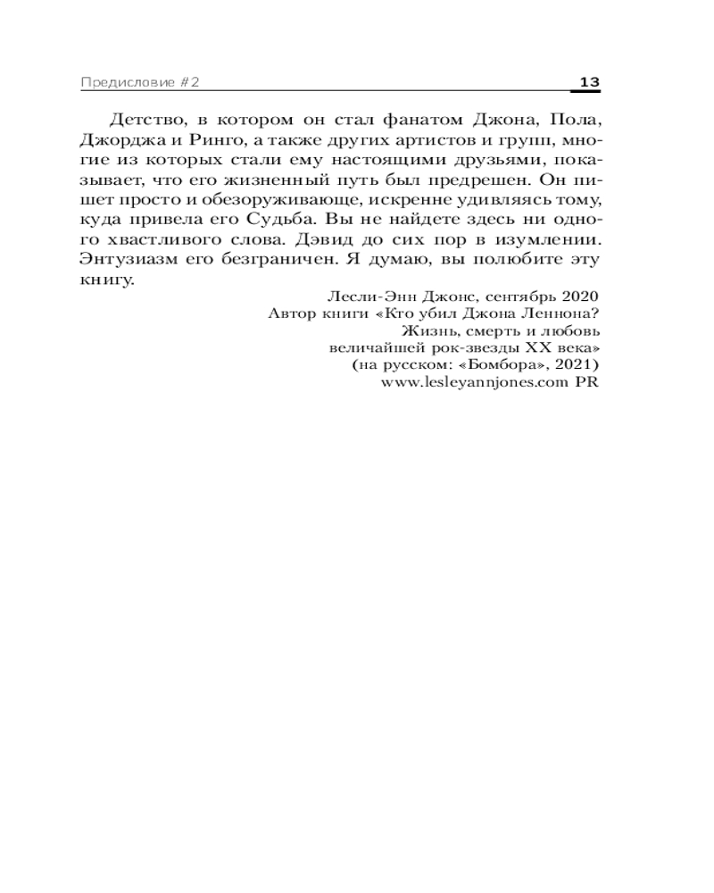 Вы не найдете здесь ни одного хвастливого слова. Дэвид до сих пор в изумлении. Энтузиазм его безграничен. Я думаю, вы полюбите эту книгу», — Лесли-Энн Джонс, писатель, автор книги «Кто убил Джона Леннона? Жизнь, смерть и любовь величайшей рок-звезды XX века».