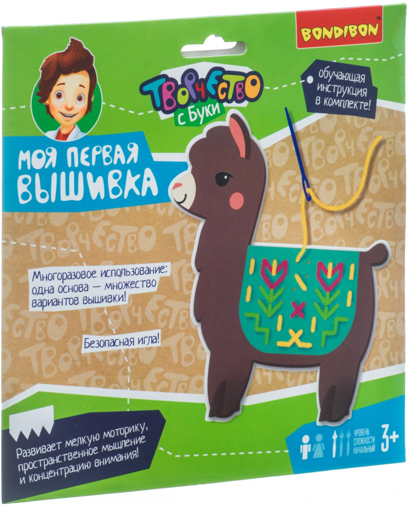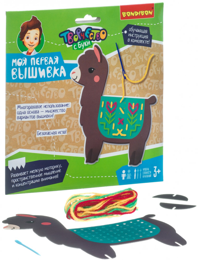 Прививать интерес к рукоделию можно уже в три года! В этом наборе от Bondibon вместо канвы — лама из прочного материала, толстые разноцветные нити и безопасная пластиковая игла, играя с которыми, ребенок сможет развить пространственное мышление (ведь ниточка, следуя за иголкой, то прячется, то появляется), мелкую моторику, цветовосприятие, речевые навыки. Набор для творчества Bondibon «Матршка» поможет научиться делать разные виды стежков.